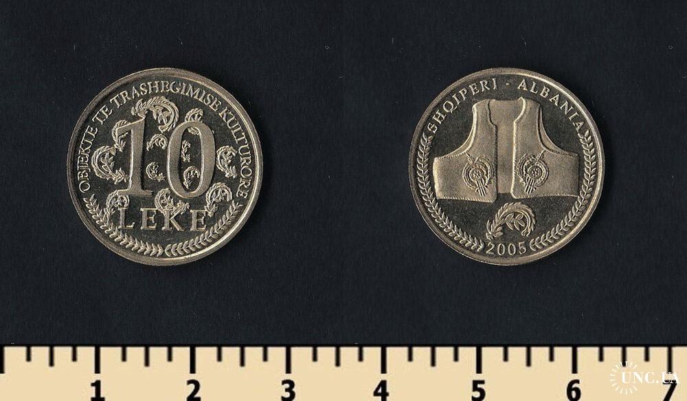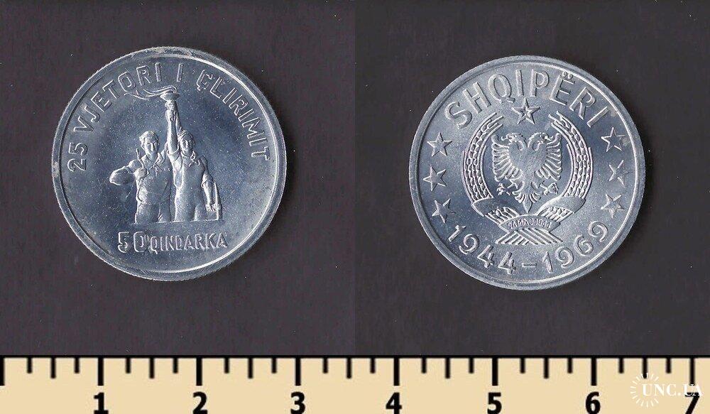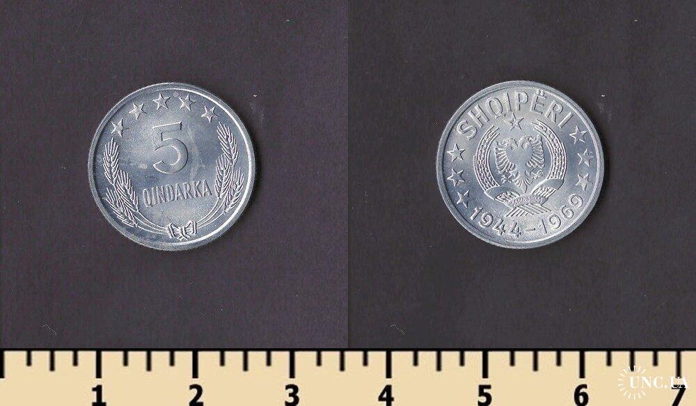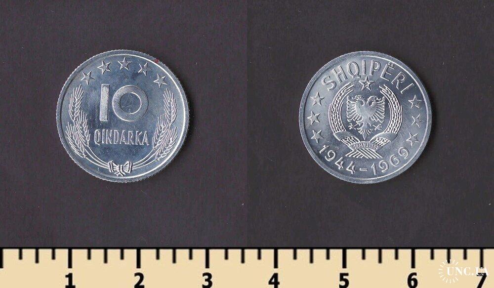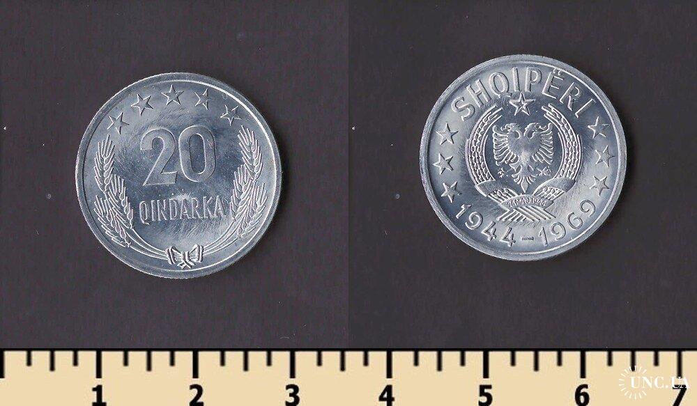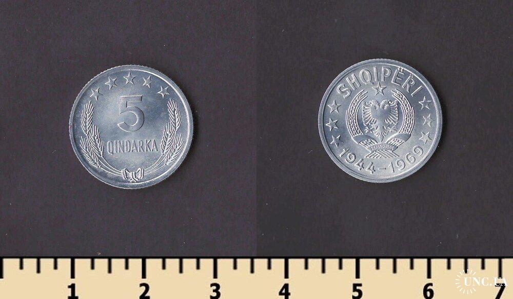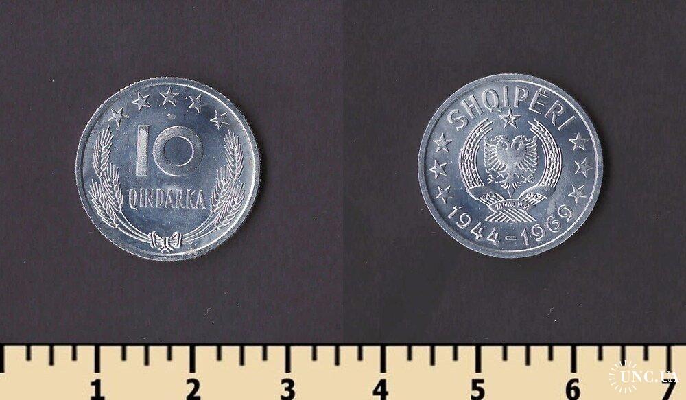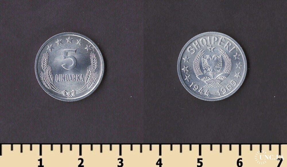 Денежная единица Албании — албанский лек. 1 лек равен 100 киндарок. Первые албанские монеты номиналами 5 и 10 киндаров лека, 1/4, 1/2 и 1 лек, 2, 5, 20 и 100 франков были выпущены в обращение в 1926 году. Все монеты были отчеканены в Италии, на римском монетном дворе и имели обозначение в виде латинской буквы R. Монеты с этими номиналами до сих пор в обращении.
