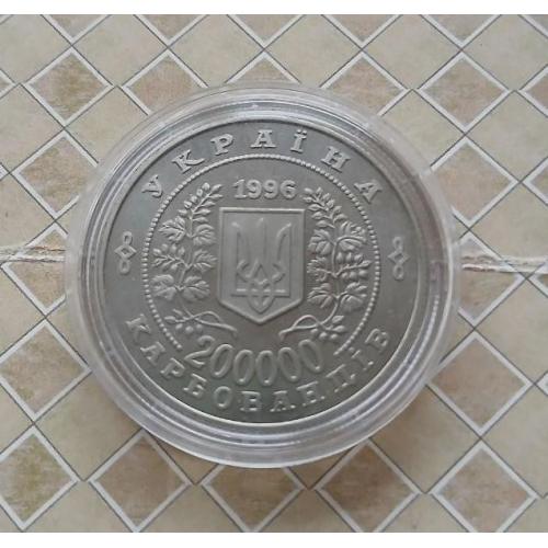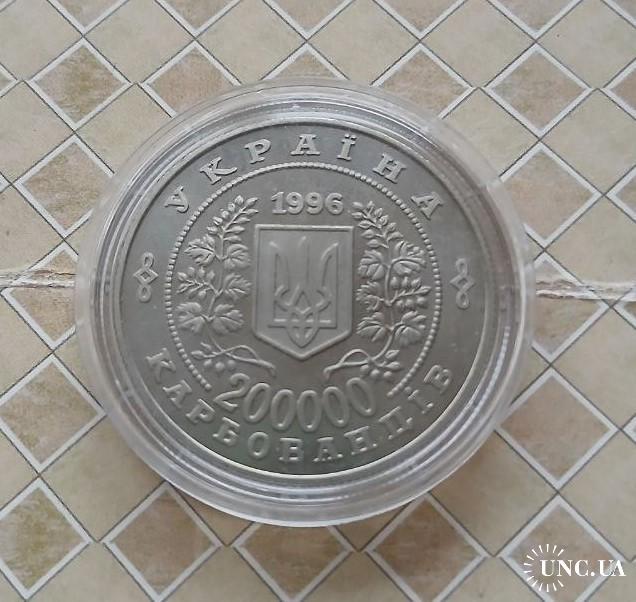 Original25 апреля 1996 года — «10-річчя Чорнобильської катастрофи«. Монета из мельхиора номиналом 200 000 карбованцев вернулась к первоначальным параметрам: вес 14,35 грамма, диаметр 33 мм, качество чеканки пруф-лайк, рифленый гурт. Эту монету НБУ выпустил тиражом 250 000 штук.