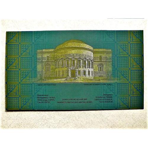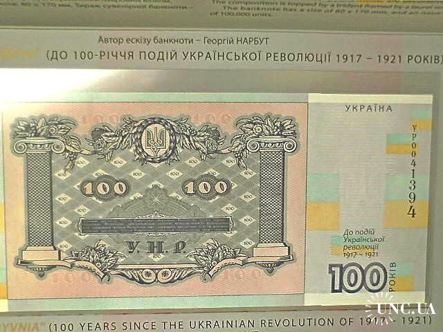 Сувенірна банкнота `Сто гривень` відтворює дизайн української банкноти номінальною вартістю 100 гривень, введеної в обіг 17 жовтня 1918 року. Навесні 1918 року український уряд ухвалив рішення змінити назву вітчизняних грошей із `карбованців` на `гривні`, бажаючи підкреслити спадковість традицій державотворення з часів Київської Русі. Найціннішою з мистецького погляду була купюра номіналом 100 гривень, розроблена і виконана Г. Нарбутом, на якій зображено пишний вінок із квітів, плодів, овочів, пшениці. Обабіч стоять жінка в національному вбранні зі снопом пшениці та серпом у руці і чоловік у фартуху, що спирається на молот, обвитий лавром. Написи зворотного боку включено у великий картуш із рослинно-плодового орнаменту, а по боках - декоративні колони. Увінчує всю композицію тризуб, обрамлений лавровим вінком. Банкнота виготовлена на папері з водяним знаком (зображення тризуба). Її розміри: 80 х 170 мм.