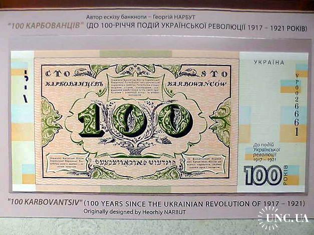 На відзначення 100-річчя подій Української революції 1917 - 1921 рр. і перших українських паперових грошей Національний банк України випустив сувенірну банкноту `Сто карбованців`, яка відтворює дизайн першої української банкноти - державного кредитового білета номіналом 100 карбованців (автор ескізу банкноти - Георгій Нарбут). Зображення на цій банкноті тризуба стало одним із головних чинників утвердження великокняжого знака Володимира Великого як Державного герба УНР і майже на два місяці випередило відповідний закон Центральної Ради про Державний герб. Під час виготовлення сувенірної банкноти використано спеціальний захищений папір, який складається з волокон льону - до 85% та бавовняної целюлози. Папір банкноти містить локальний водяний знак у вигляді тризуба, середній зуб якого увінчаний хрестом. Розміри банкноти: - 80 х 170 мм.