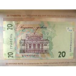 (14) Памятна банкнота 20 гривень до 160-річчя від дня народження І. Франка в сувеніркі