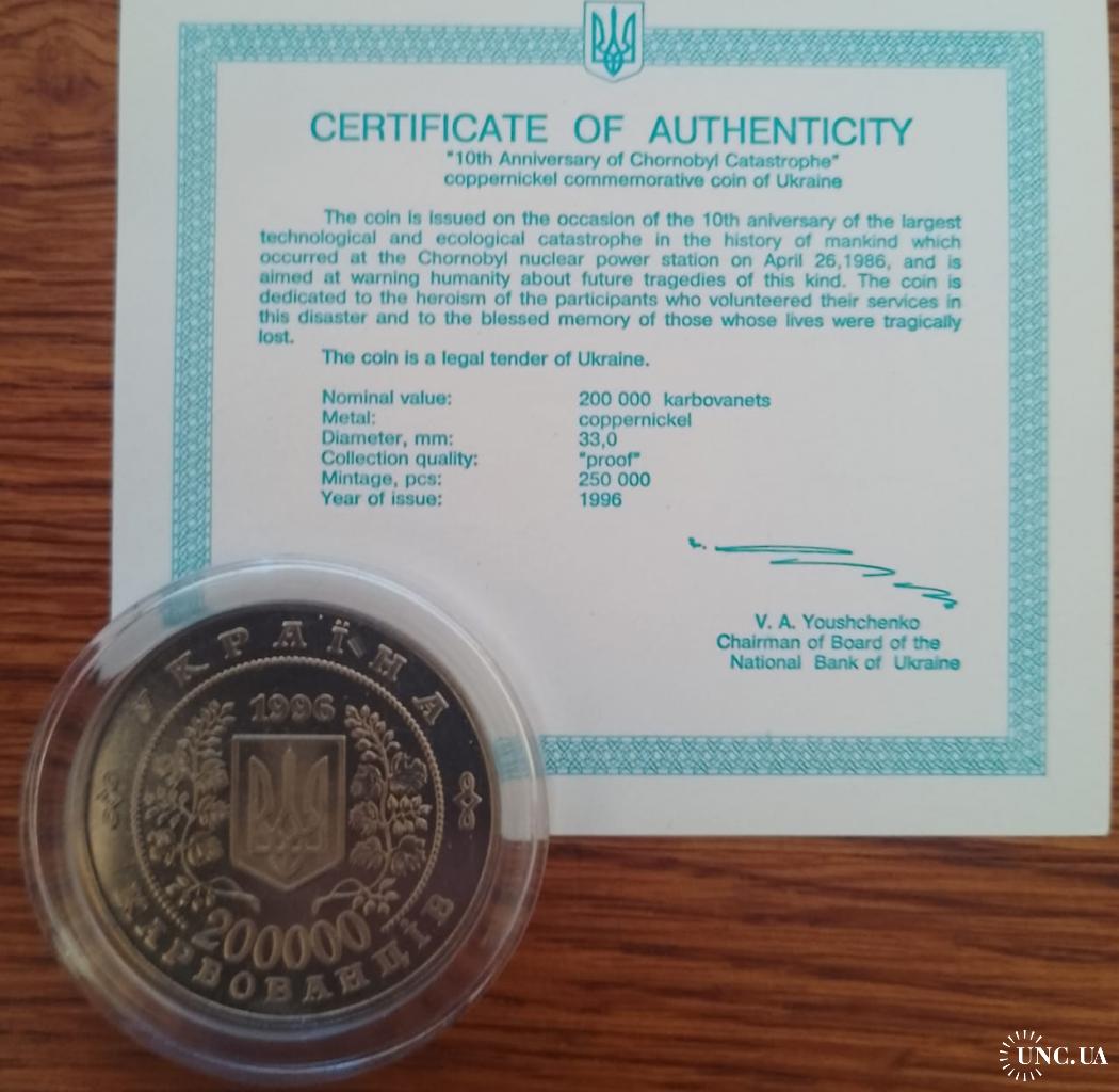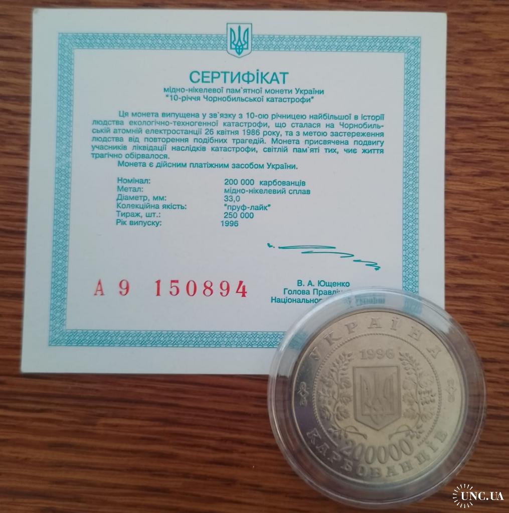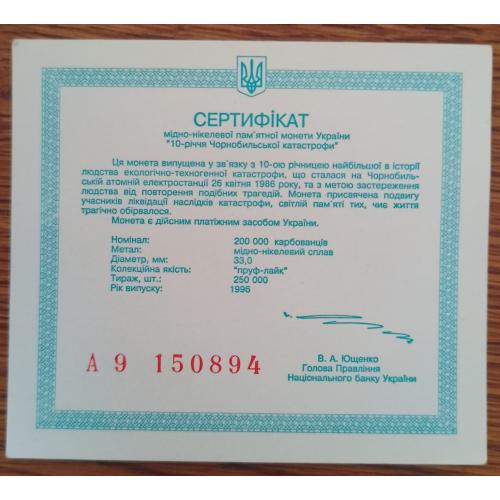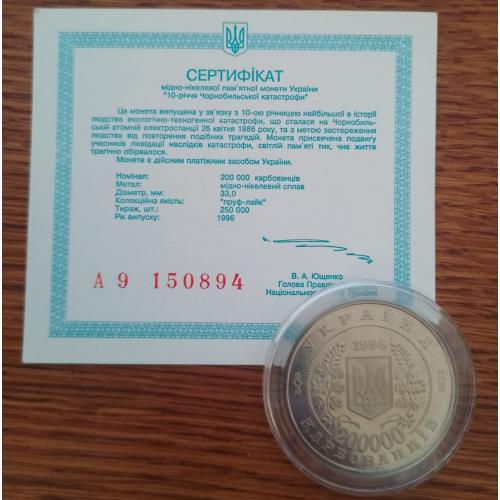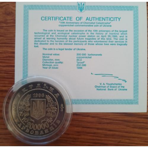 Original200000 карбованцев 1996 года посвящённые 10 годовщины аврии на ЧАЭС.