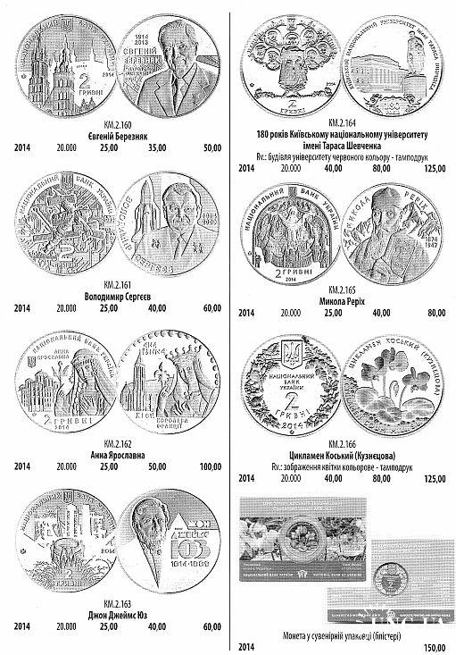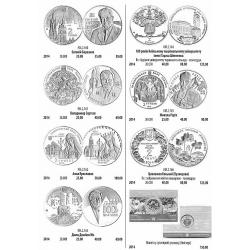 Каталог содержит изображения, технические параметры и рыночные цены на монеты Украины 1992-2014 гг. выпуска по трём степеням сохранности. В каталог также включена сувенирная продукция Монетного двора НБУ: платы, жетоны, медали,а также каталог бумажных денежных знаков Украины 1991 - 2014 годов.