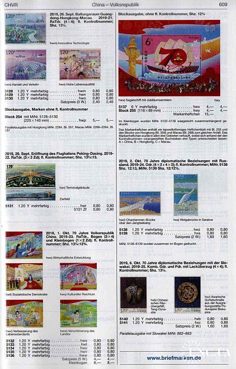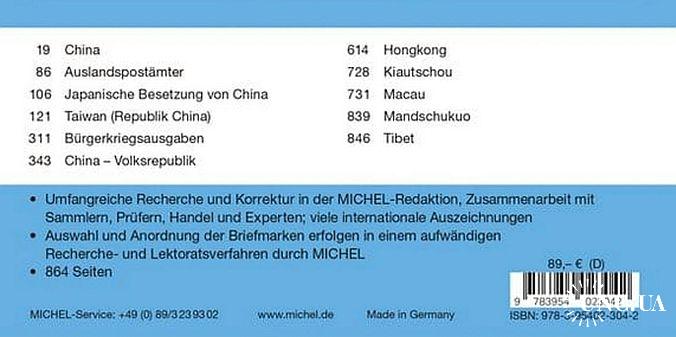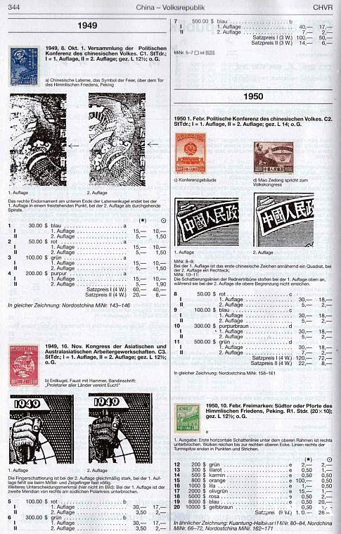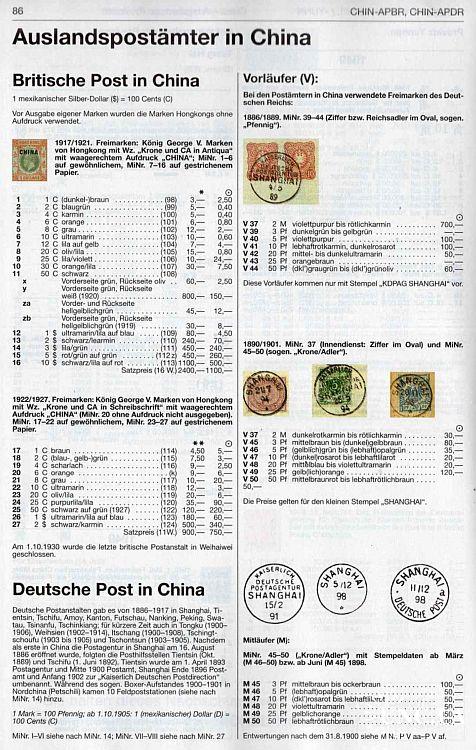 В каталоге широко представлены разные периоды истории Китая, а также прилегающие государства: Гонконг, Зарубежная почта в Китае, Китай (Империя и республика), КНР, Макао, Маньчжоу (Mandschukuo), Тайвань, Тибет, Цзяо-Чжоу (Kiautschou) и Японская оккупация Китая. Документ в формате PDF с постраничным интерактивным содержанием.