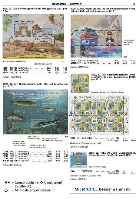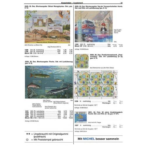 Составление частей Kasachstan, Kirgisien, Tadschikistan, Turkmenistan, Usbekistan из каталога Michel Mittelasien 2014 и дополнений, сделанных новыми выпусками марoк из Мichel Rundschau до номера 6/2018. В каталоге представлены почтовые марки Казахстана, Кыргызстана, Таджикистана, Туркменистана и Узбекистана.