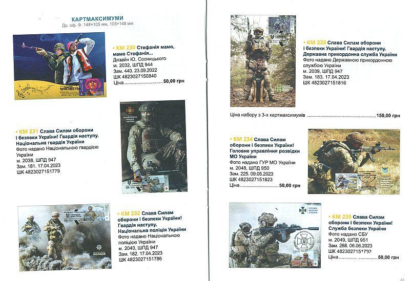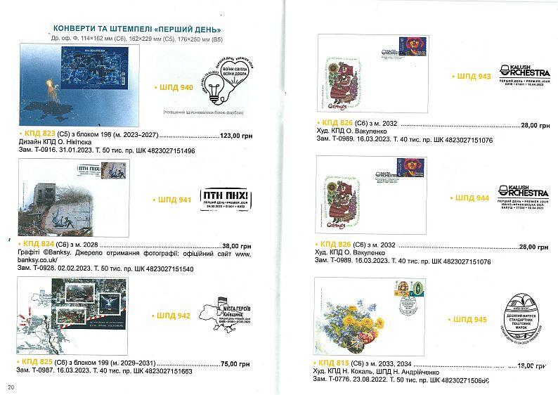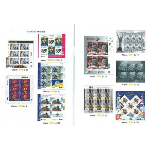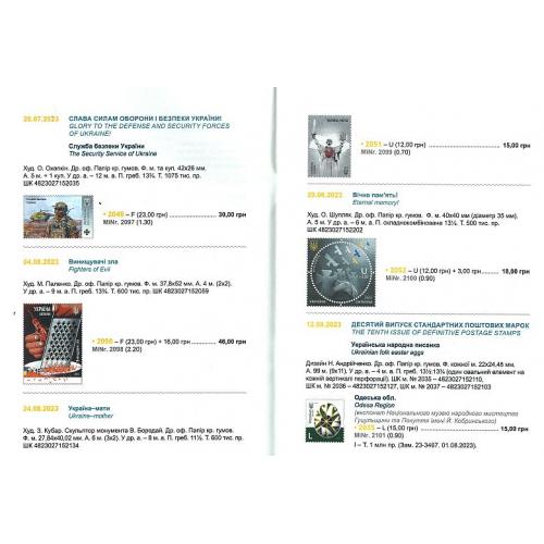 Каталог знаків поштової оплати України містить інформацію про випуски поштових марок, блоків, маркових аркушів, штемпелів "Перший день", спеціальних поштових штемпелів, маркованих та немаркованих конвертів, немаркованих карток за 2023 рік.