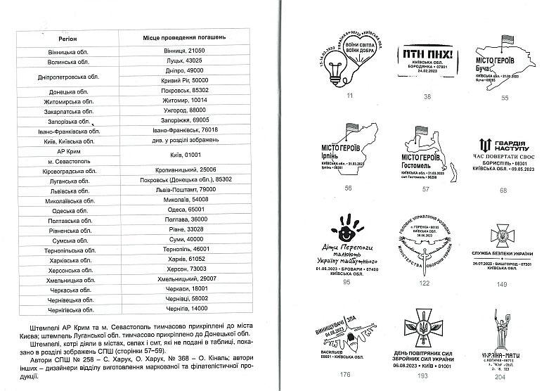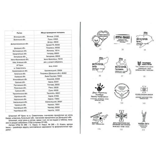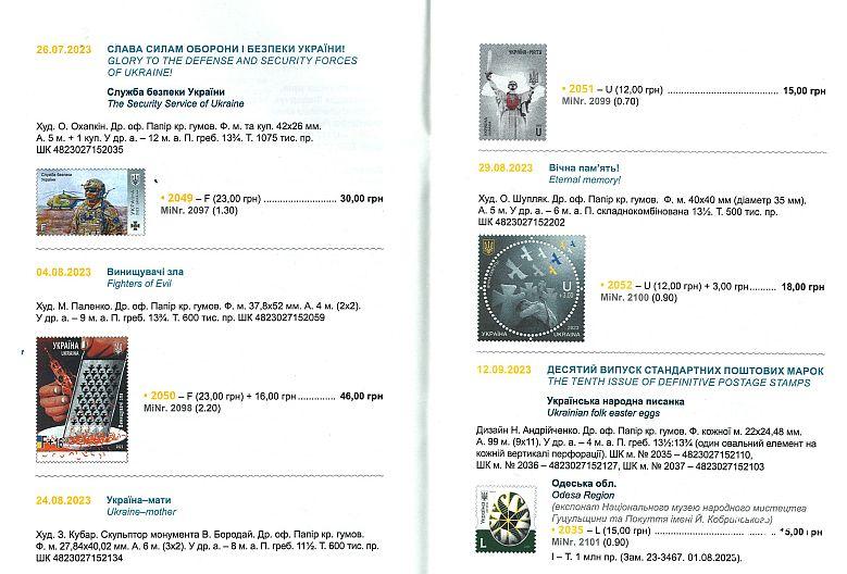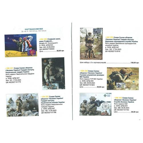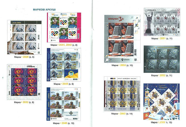 Каталог знаків поштової оплати України містить інформацію про випуски поштових марок, блоків, маркових аркушів, штемпелів "Перший день", спеціальних поштових штемпелів, маркованих та немаркованих конвертів, немаркованих карток за 2023 рік.