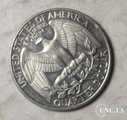 Это монета США номиналом 25 центов (квотер) с изображением Вашингтона, выпущенная в 1992 году:На аверсе изображен профиль Джорджа Вашингтона, первого президента США.