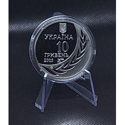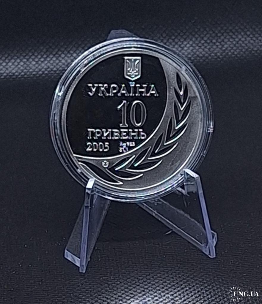 На аверсі монети праворуч на рельєфному тлі півколом зображено оливкову гілку, яка прикрашає емблему ООН (символ миролюбства), на дзеркальному тлі розміщено малий Державний Герб України, ліворуч написи: УКРАЇНА/ 10/ ГРИВЕНЬ/ 2005, позначення металу, його проби - Ag 925, вага в чистоті - 31,1 та логотип Монетного двору Національного банку України.