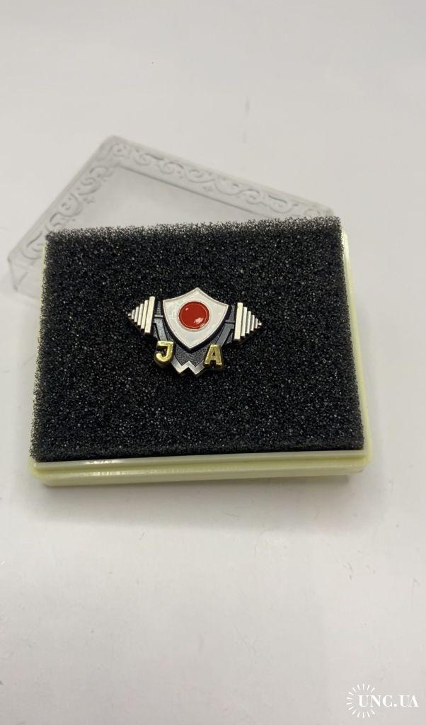 1981-20006к83 Знак Федерация тяжёлой атлетики Японии в коробке. Спорт, штанга, Япония. Тяжелый металл.