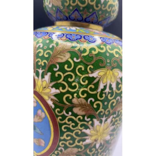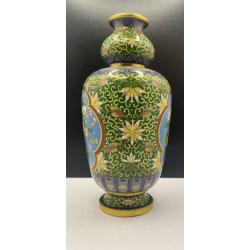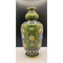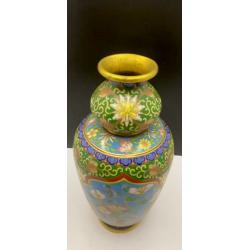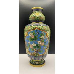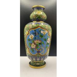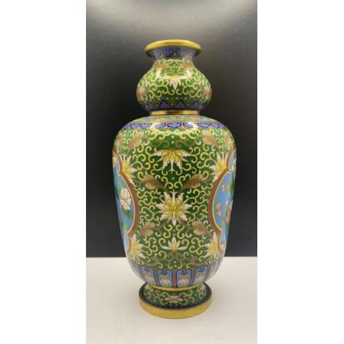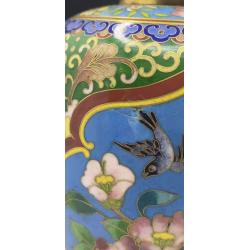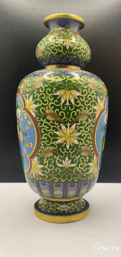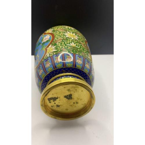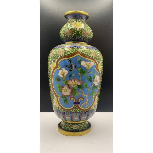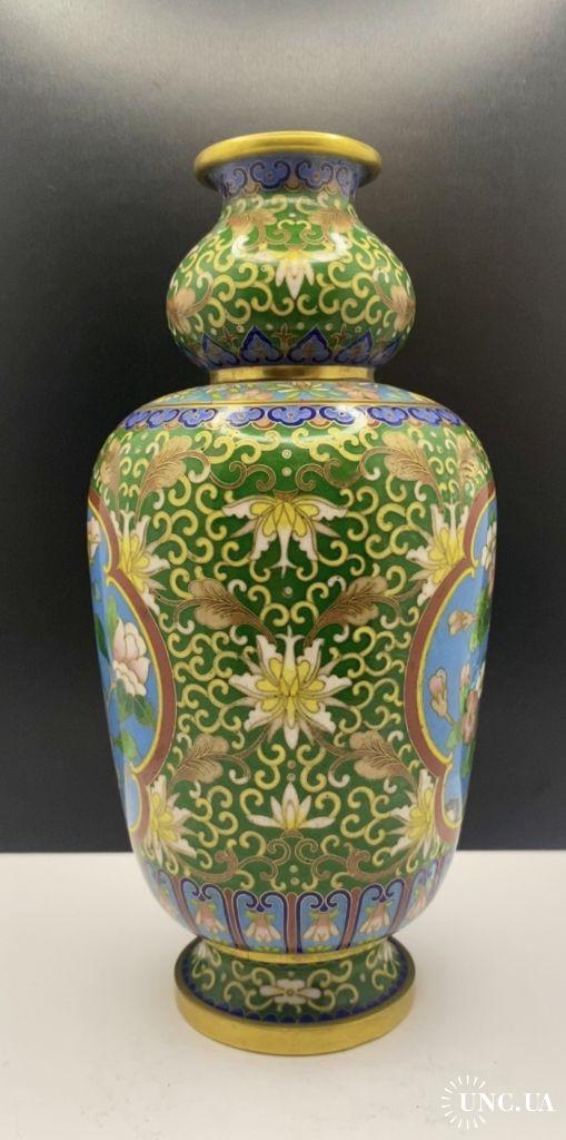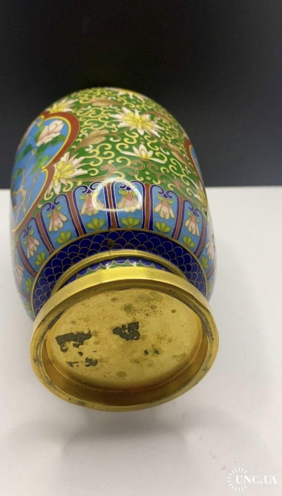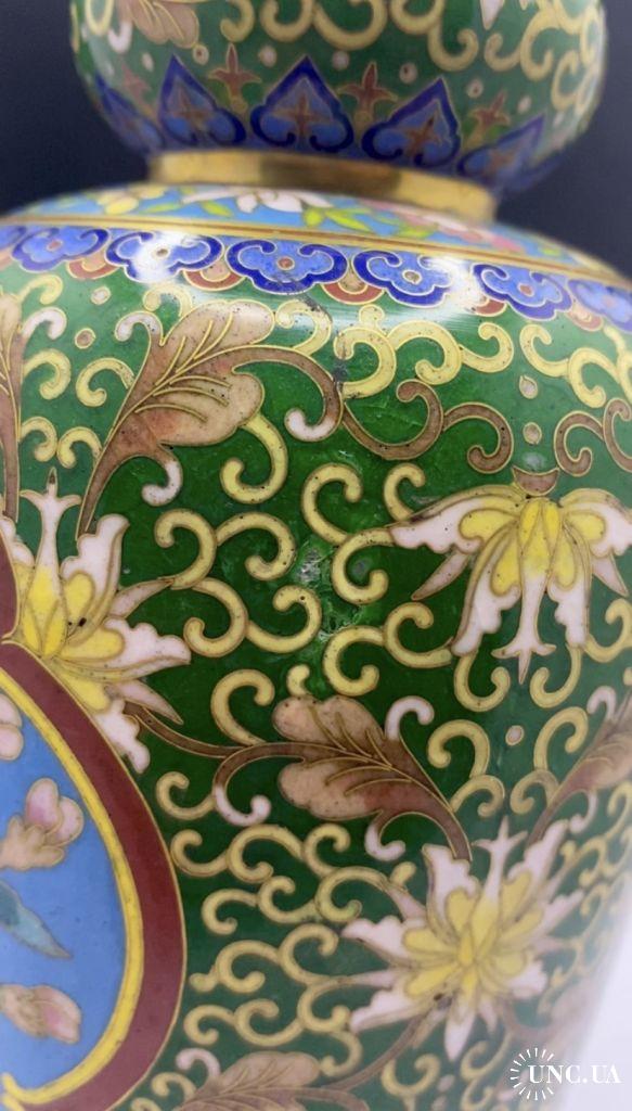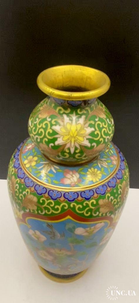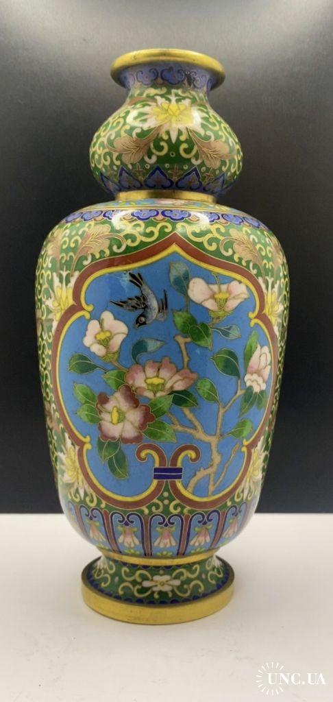 1981-20006lt102 Винтажная ваза, перегородчатая эмаль, клуазоне, Китай. Цветы, птицы, орнамент. Есть 2 незначительных повреждения (на фото видно). Высота 22 см Тяжелый металл