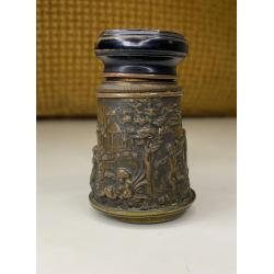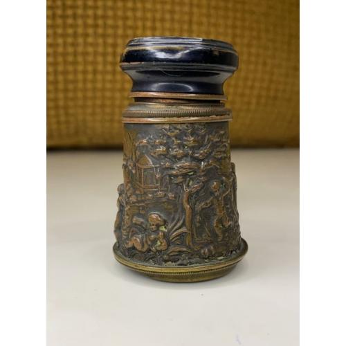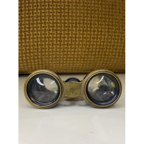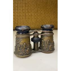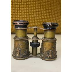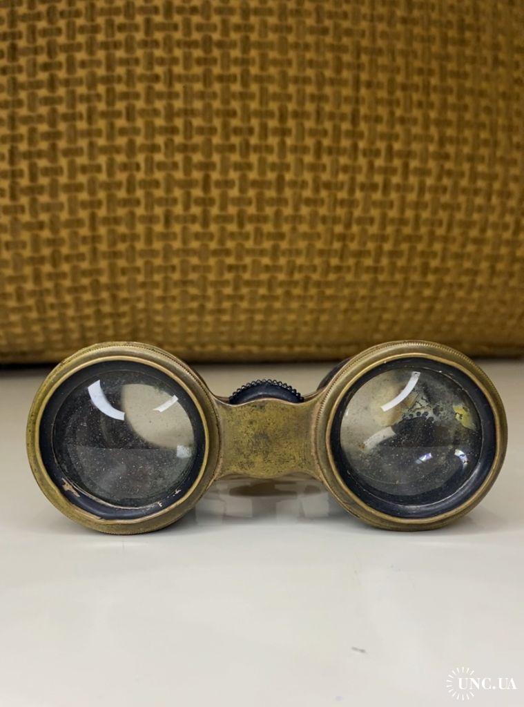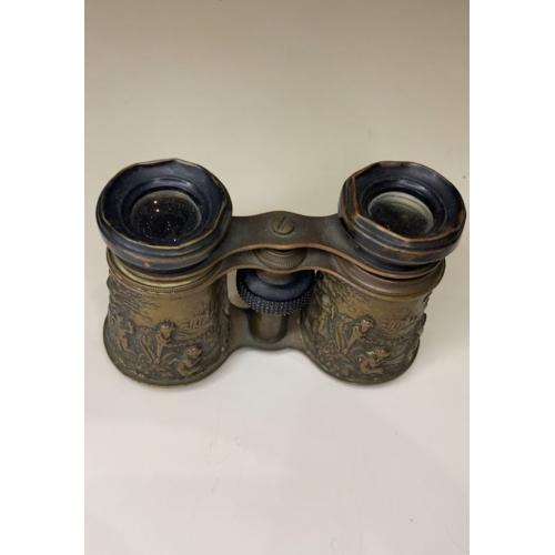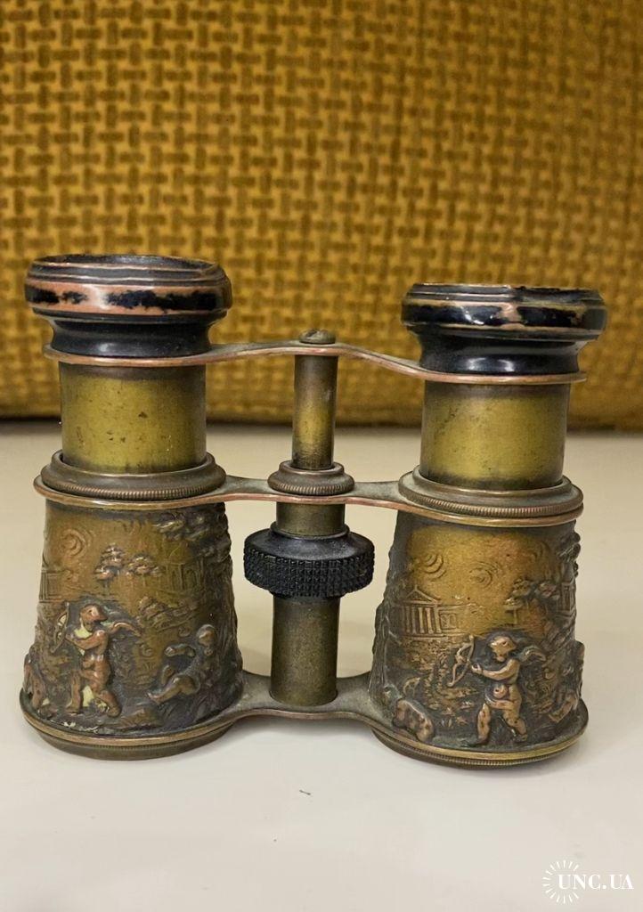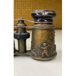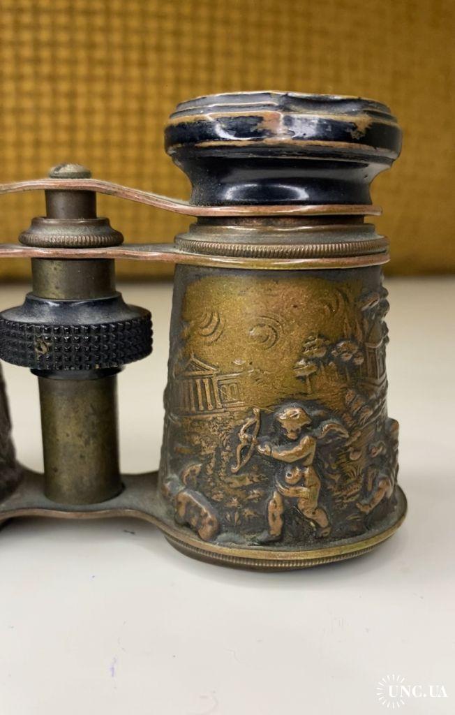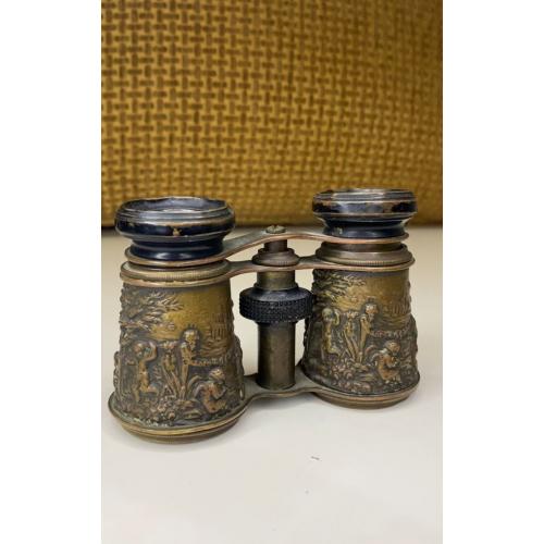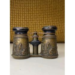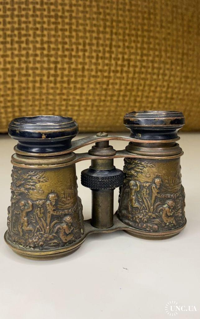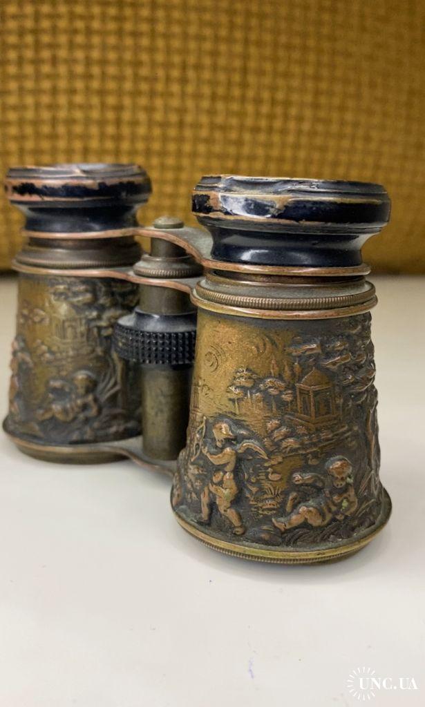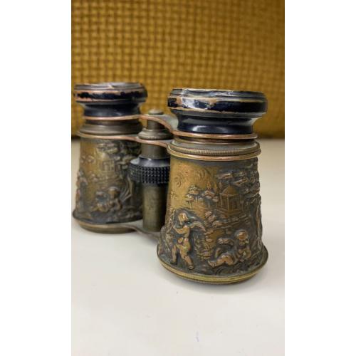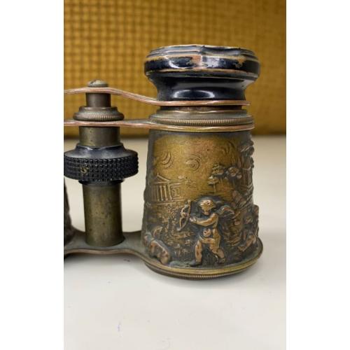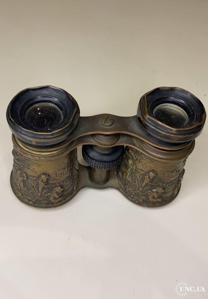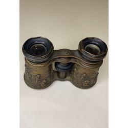 1901-19206lt26 Театральный (оперный) бинокль с рельефным декоративным орнаментом. Конец XIX - начало XX столетия. Металл, стекло. Есть деформация, на фото видно.