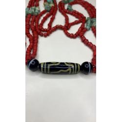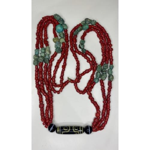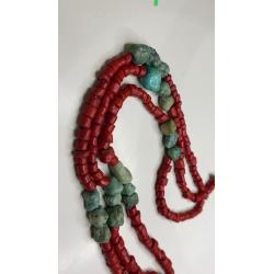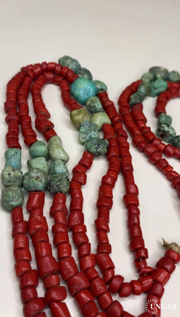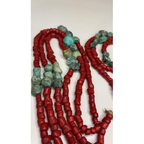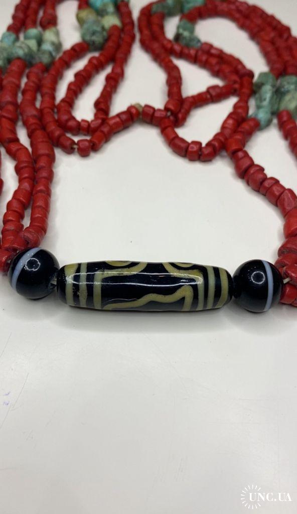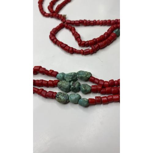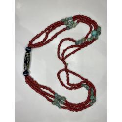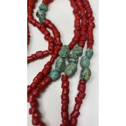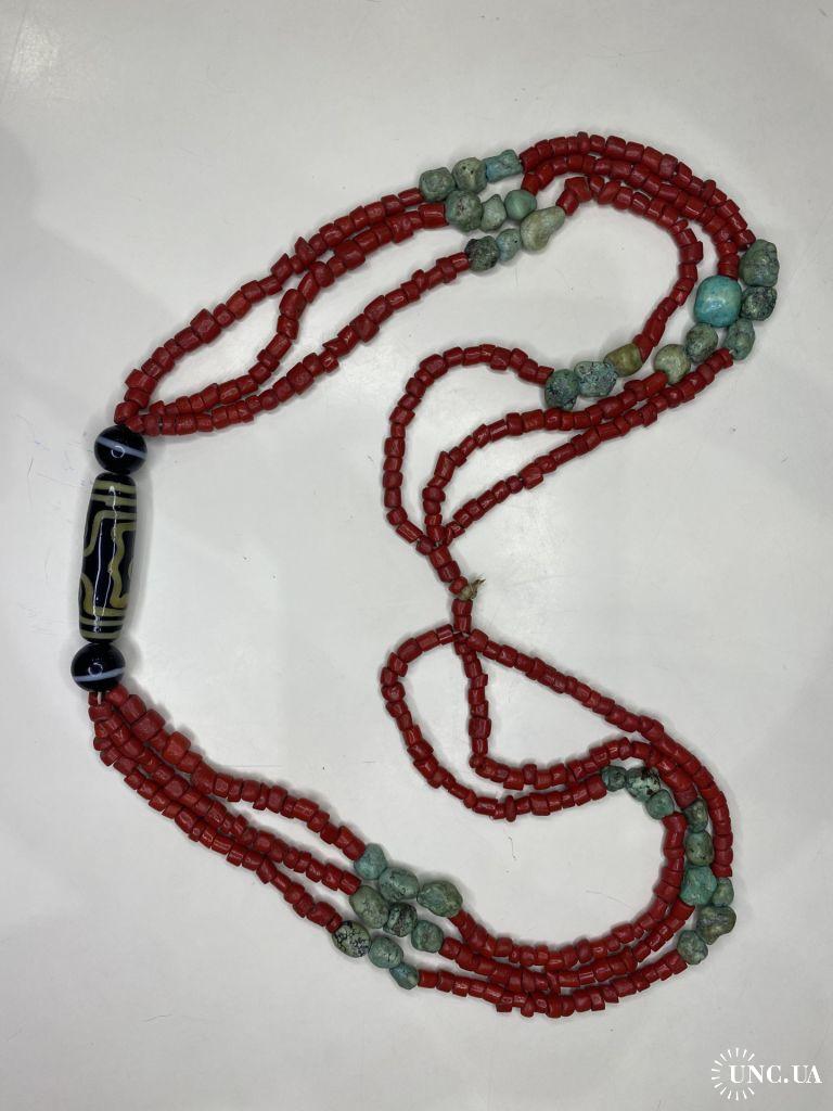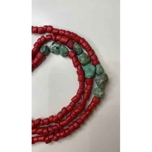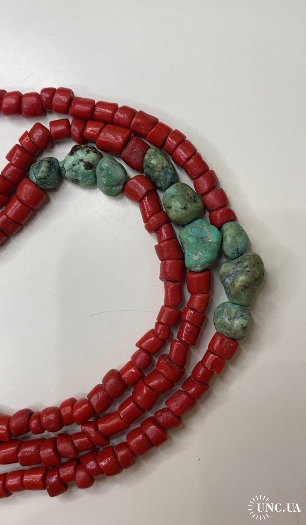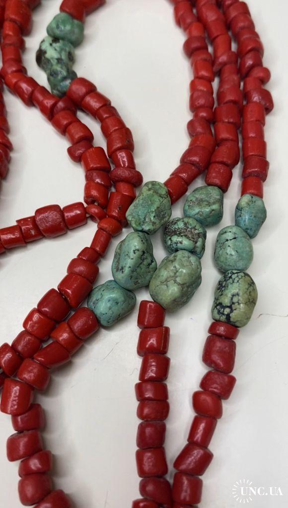 1981-20006lt6 Бусы. Красные бусины очень похожи на коралл, зелёные бусины с прожилкой на бирюзу или варисцит. Полуобхват 35 см