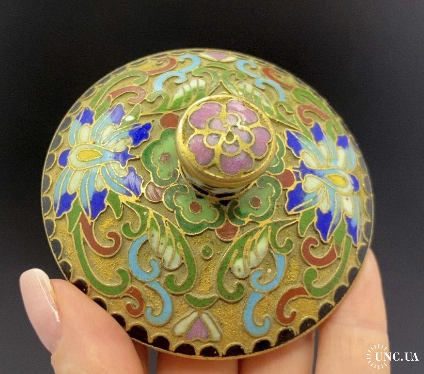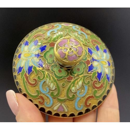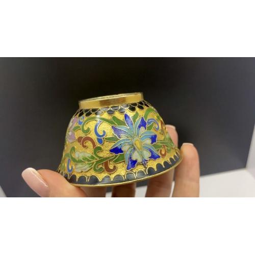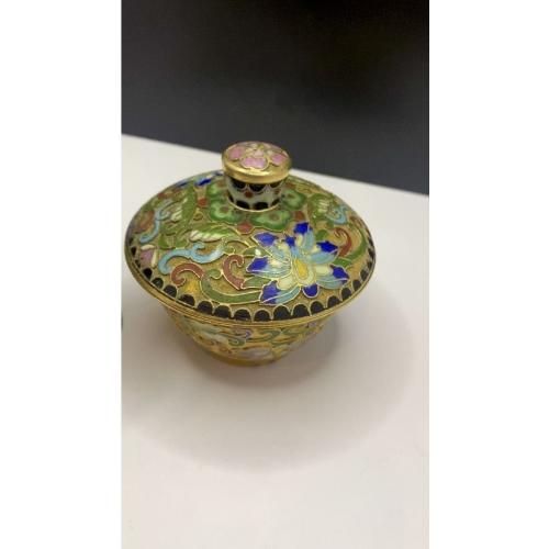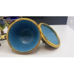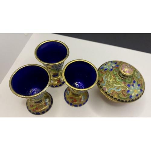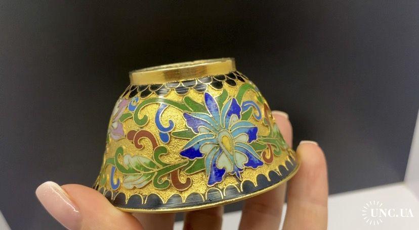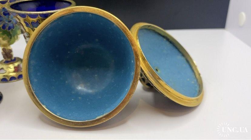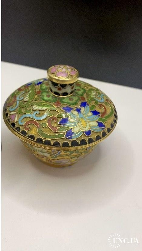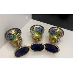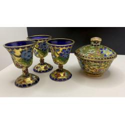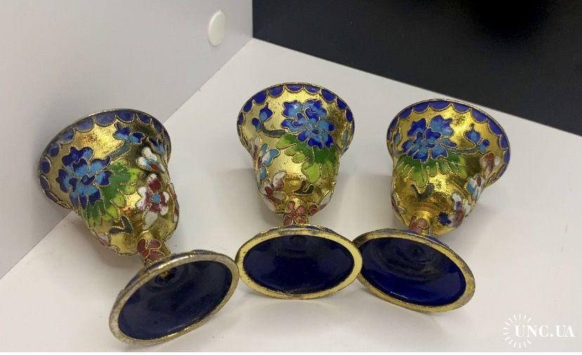 1981-20006lt68 Рюмка клуазоне (3 шт) и сахарница клуазоне. Китай, винтаж. Металл, эмаль. Рюмки немного отличаются по высоте. Состояние хорошее.