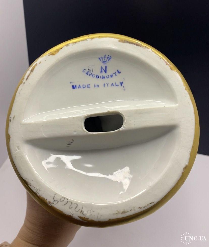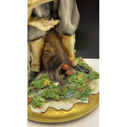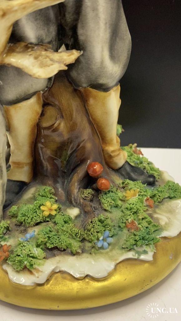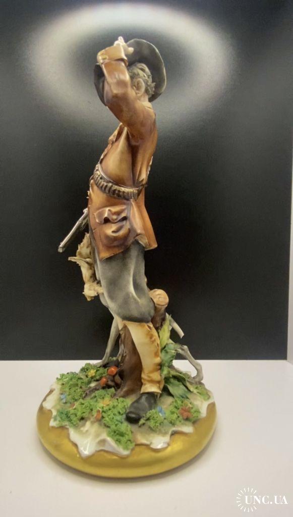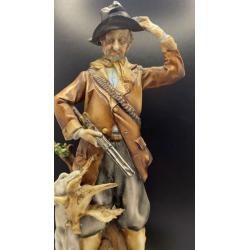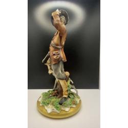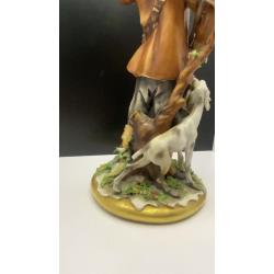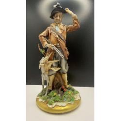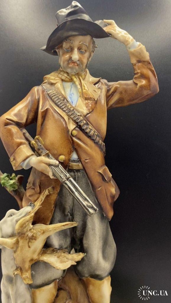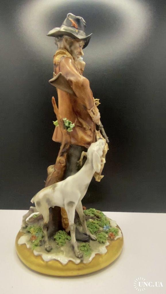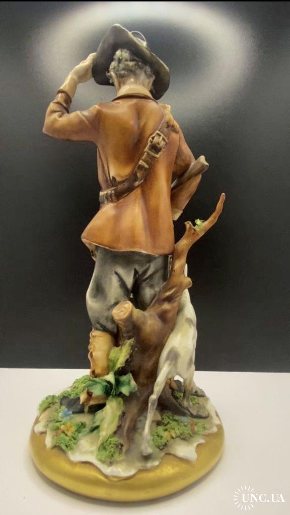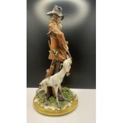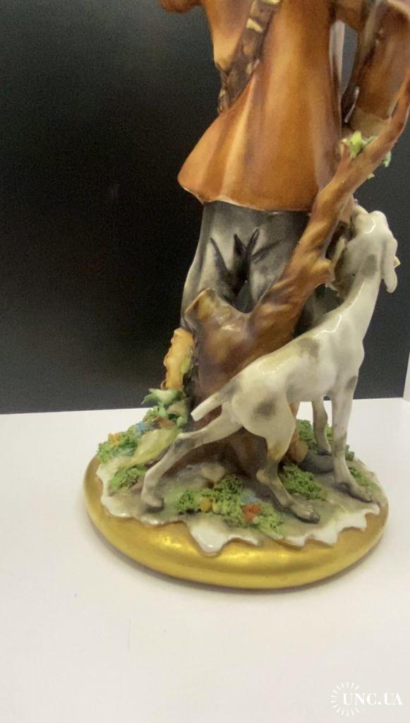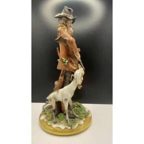 1981-20006lt81 Статуэтка охотник с собакой и добычей. Фарфор. Италия. Capodimonte. Высота 27 см Скол хвоста собачки. В остальном потерь не замечено.