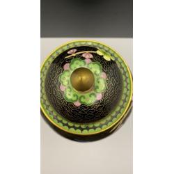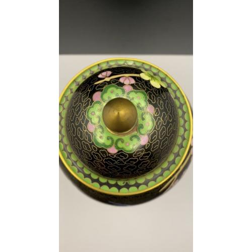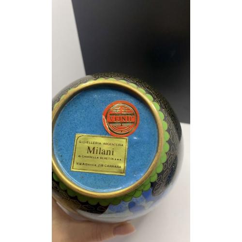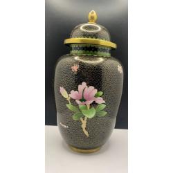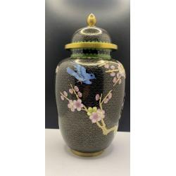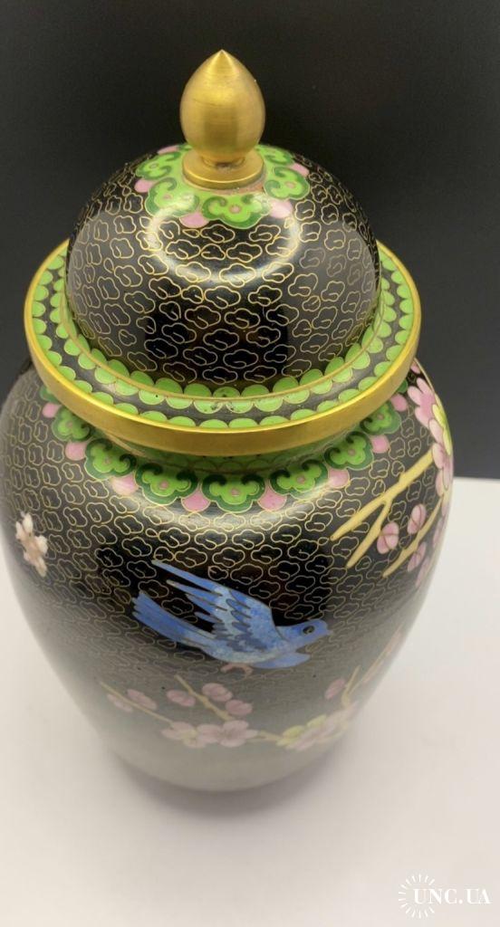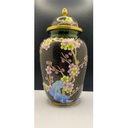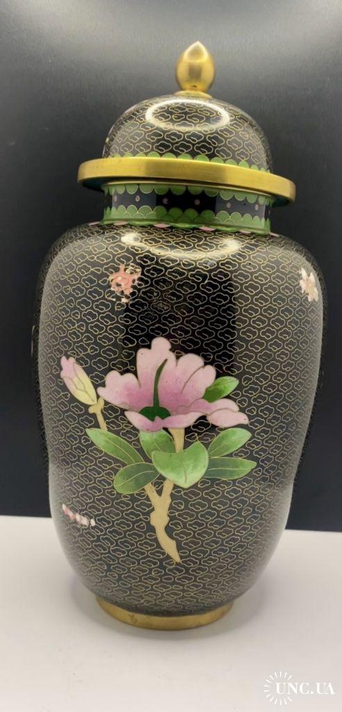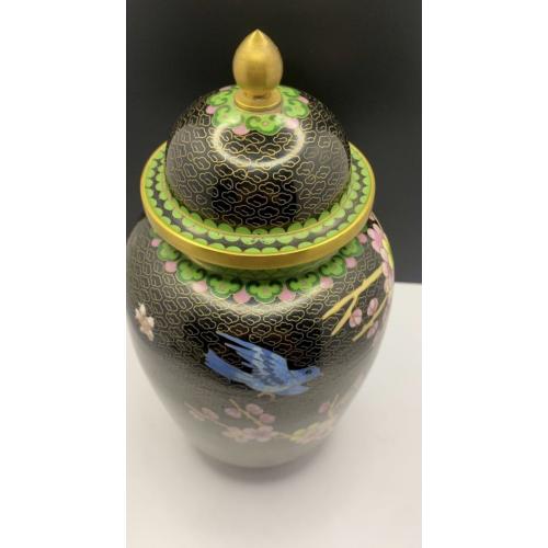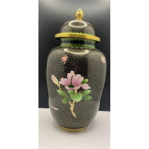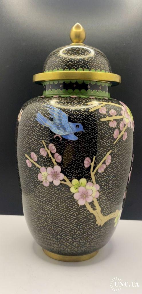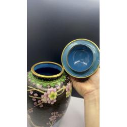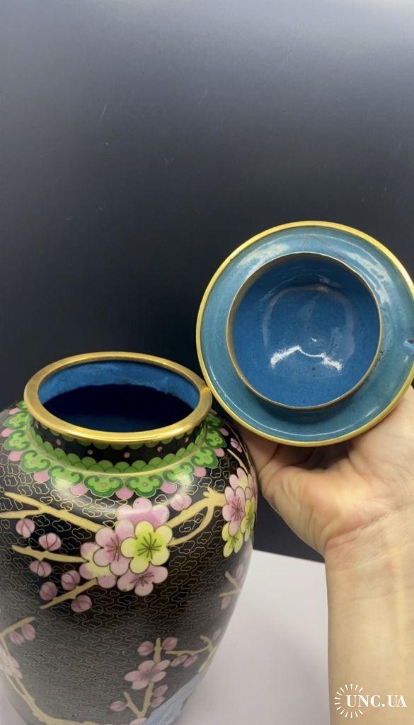 1961-19806lt97 Ваза с крышкой. Клуазоне, перегородчатая эмаль, Китай или Япония , середина 20 века. Цветы, ветки сакуры. На одной стороне есть небольшая вмятина и скол черной эмали не до метала, в остальном состояние хорошее.