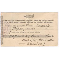 "7-ми классное Коммерческое училище Общества распространения в г. Киеве средн. коммерч. образов. со совместным обучением. Получено от ученика 7 класса Касилия Пархоменко за 1 половину 1916 года за право учения сорок пять рублей ноября 23 дня 1916 г."