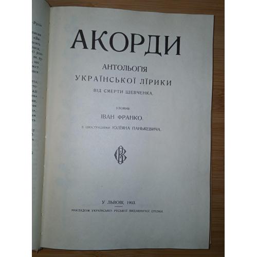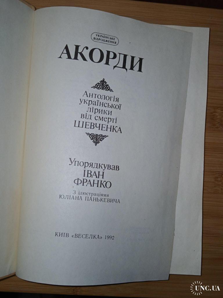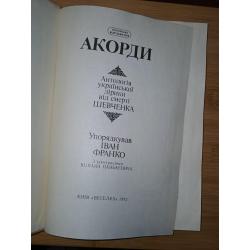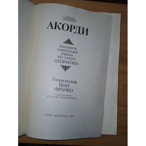 Майже 90 років тому у Львові побачила світ антологія `Акорди`, з любов`ю упорядкована Іваном Франком. Книга, що репрезентувала творчість 88 поетів другої половини XIX- початку ХХ століття, стала помітним явищем у духовному житті України, але відтоді жодного разу, на жаль, не перевидавалася. Нинішня фототипна публікація з додатком (передмовою і примітками) адресована старшокласникам, педагогам, літературознавцям, усім, хто цікавиться історією розвитку української літератури.
