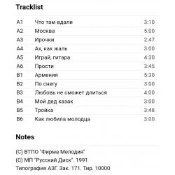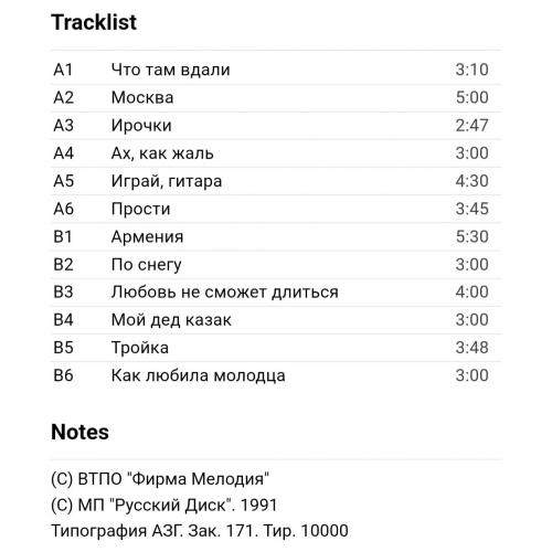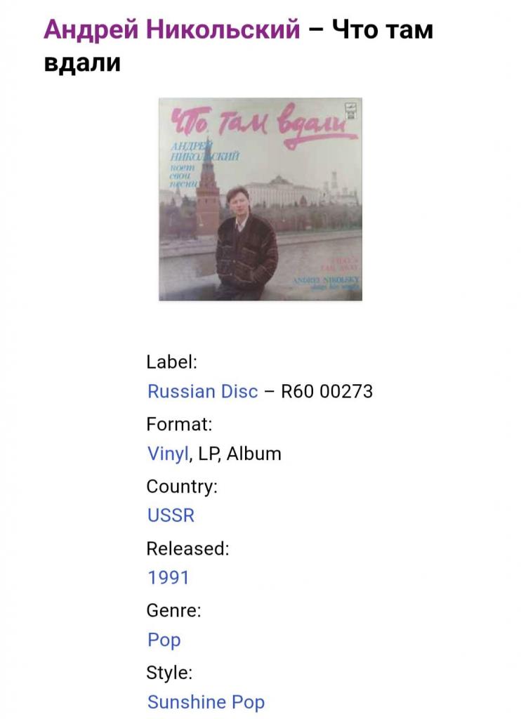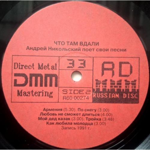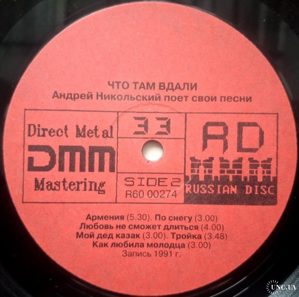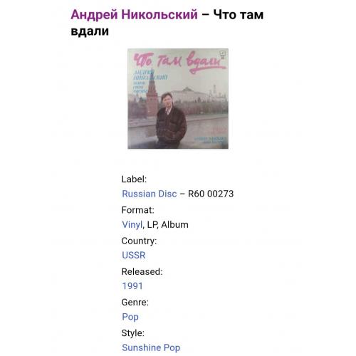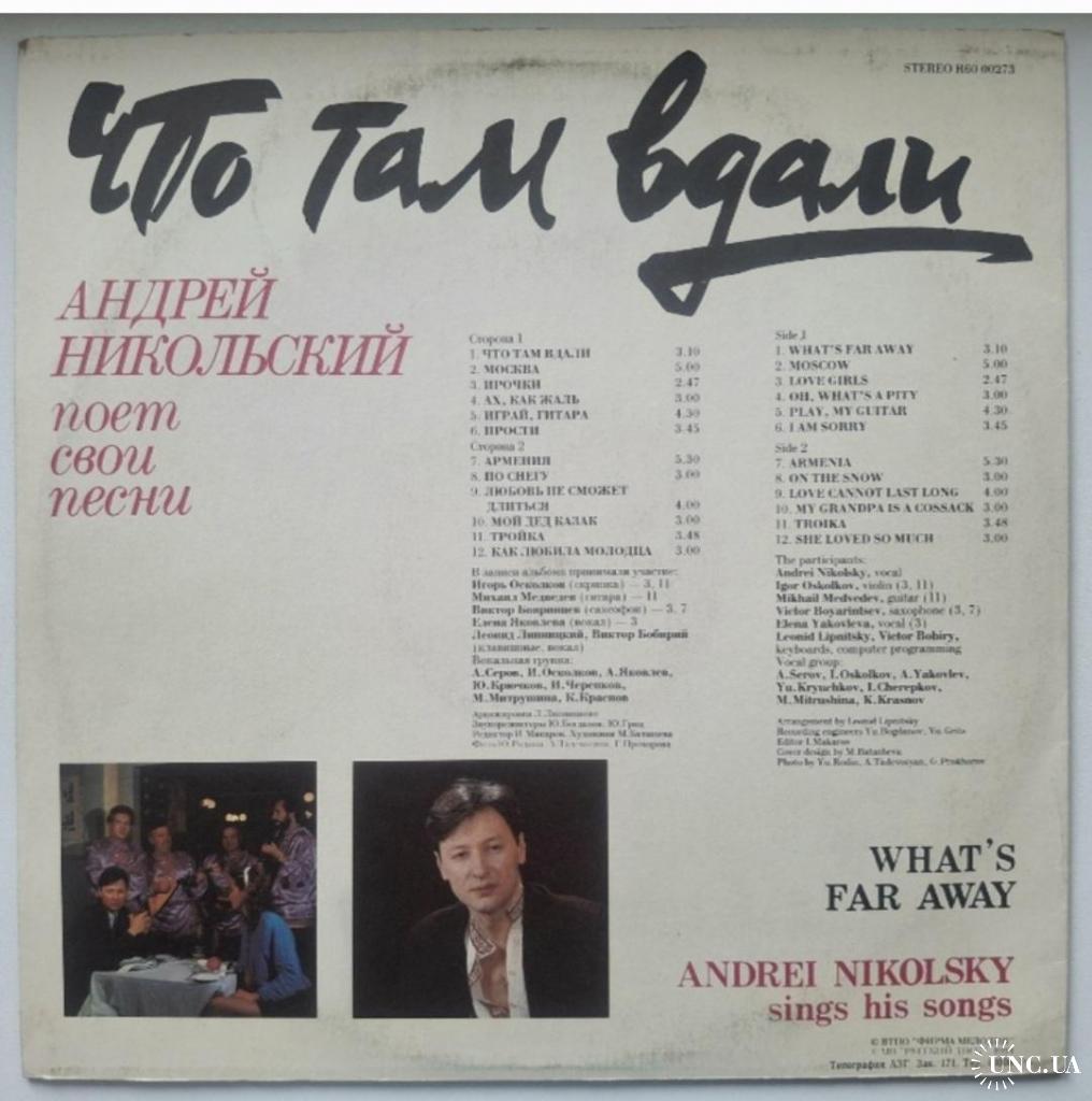 Вінілова платівка. Другий, в дискографії, студійний альбом, російського (радянського) барда, виконавця авторських пісень стилю шансон, Андрія Нікольського (Что Там Вдали) 1991. Випуск фірми (Russian Disc) Russia, 1991-ий рік. Оригінальне, першопресове видання. Лімітований тираж (Limited Edition). Рідкісне (Rare). Стан платівки NM-. Стан конверту EX+. Відправка по Україні службами доставки: Нова Пошта, Укр Пошта, Делівері. Також відправляємо посилки за кордон по цілому світу.