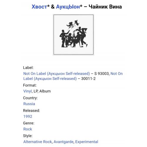 Вінілова платівка. Шостий, в дискографії, студійний альбом, російської (радянської) пост панк, джаз рок групи нової хвилі Аукцион який вони записали спільно з музикантом і художником Олексійом Хвостенко (Хвост). В складі Аукциону на той час були Олег Гаркуша, Леонід Фьодоров, Сергій Рогожин, Віктор Бондарик, Дмитро Озерський, Микола Рубанов, Микола Федорович та Ігор Чериднік (Чайник Вина) 1992. Випуск фірми (Ладь) Russia, 1992-ий рік. Оригінальне, першопресове видання. Лімітований тираж (Limited Edition). Рідкісне (Rare). Стан платівки ЕХ. Стан конверту ЕХ. Відправка по Україні службами доставки: Нова Пошта, Укр Пошта, Делівері. Також відправляємо посилки за кордон по цілому світу.