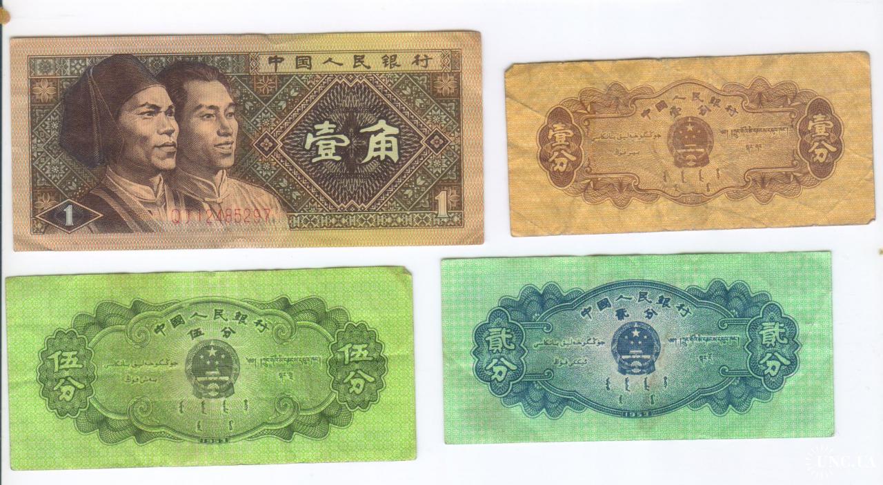 non-availableБанкноти КНР номіналом в 1, 2 і 5 фен зразка 1953, номіналом у 1 цзяо зразка 1980 року в хорошому стані. Ціна за комплект, Можливий продаж поштучно.