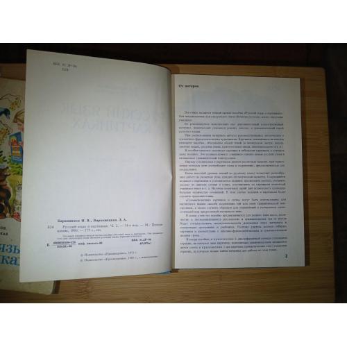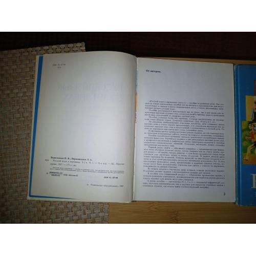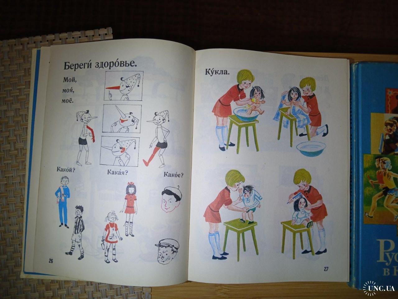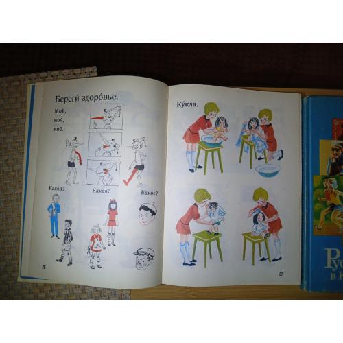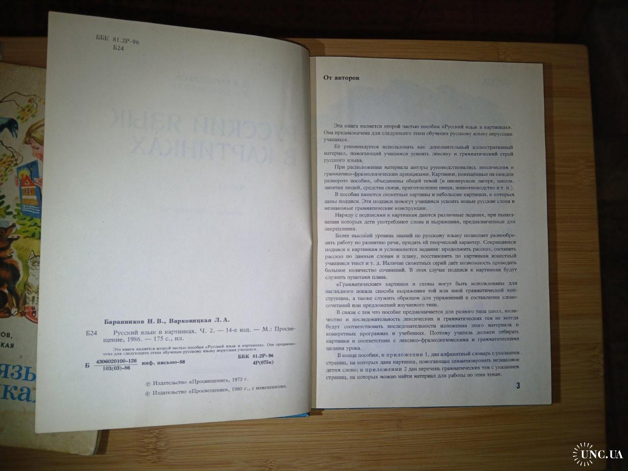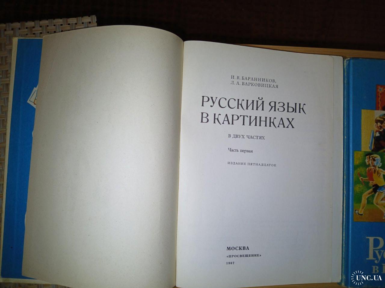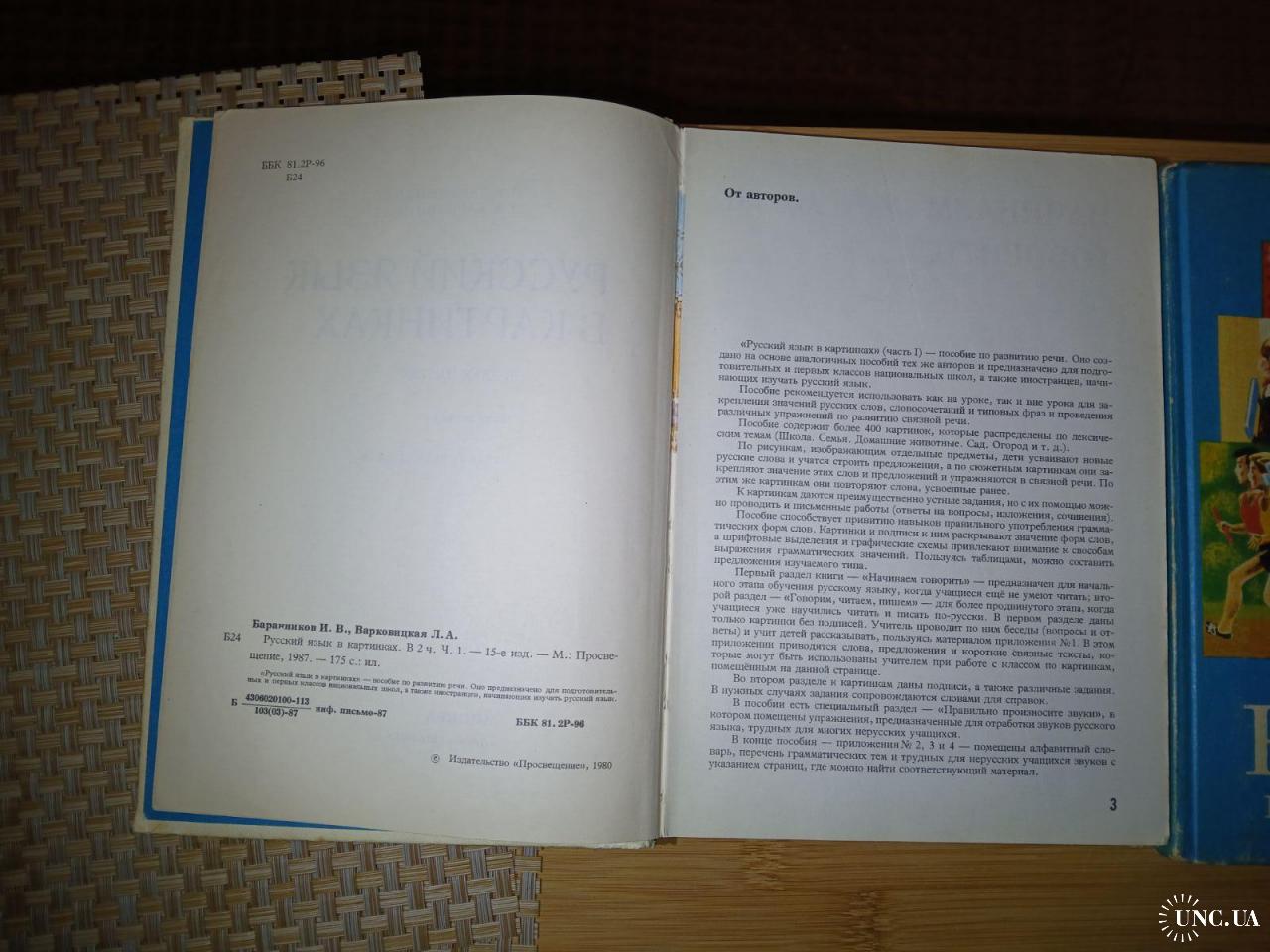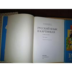 Русский язык в картинках` (в двух частях) – пользующееся признанием пособие по развитию речи, выдержавшее около двадцати изданий. Оно создано на основе аналогичных пособий тех же авторов и предназначено для подготовительных и первых классов национальных школ, а также иностранцев, начинающих изучать русский язык. Часть 1-ю пособия рекомендуется использовать как на уроке, так и вне урока для закрепления значений русских слов, словосочетаний и типовых фраз и проведения различных упражнений по развитию связной речи.