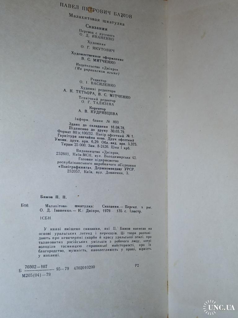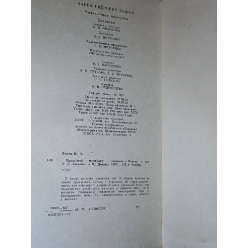 У книзі вміщено сказання, які П. Бажов написав на основі уральських легенд і переказів. Ці твори розповідають про невичерпні скарби й красу уральської землі, про талановитих російських умільців з робочого люду, котрі володіли таємницею справжньої майстерності, про їх благородство, мужність, наполегливість у праці, вірність у коханні. Наклад книги 25 тис. прим. Вага книги 240 гр.