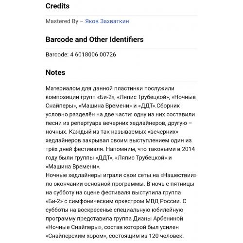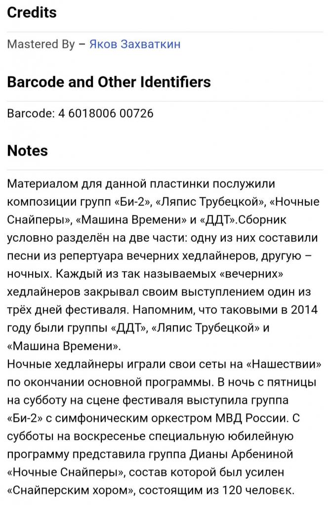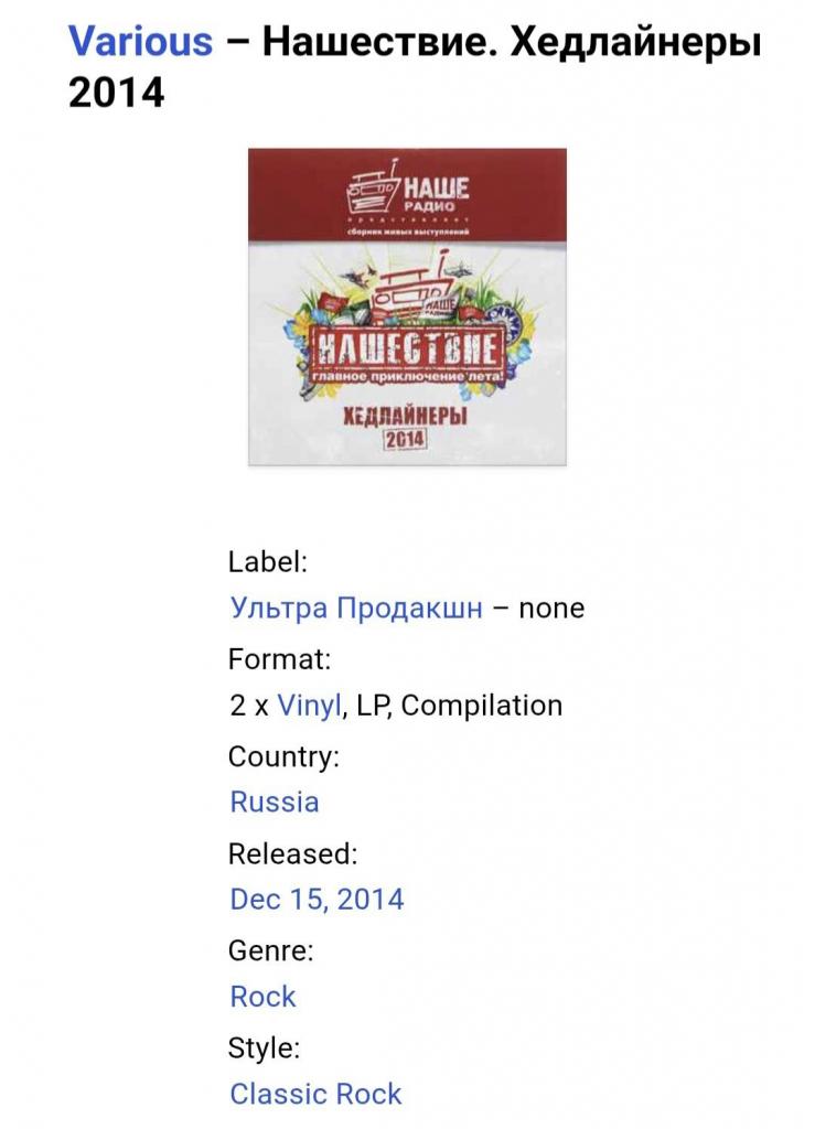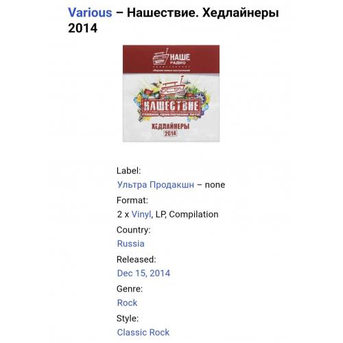 2001-2020Вінілові платівки. Живий звук. Славнозвісний рок-фестиваль Нашествие (Хедлайнеры) 2014, за участю груп Ночные Снайперы, ДДТ, БИ-2, Ляпис Трубецкой, Машина Времени. Випуск фірми (Ультра Продакшн) Russia, 2014-ий рік. Видання з двох платівок (2LP). Лімітований тираж (Limited Edition). Нове, запаковане. Категорія S/S. Відправка по Україні службами доставки: Нова Пошта, Укр Пошта, Делівері. Також відправляємо посилки за кордон по цілому світу.