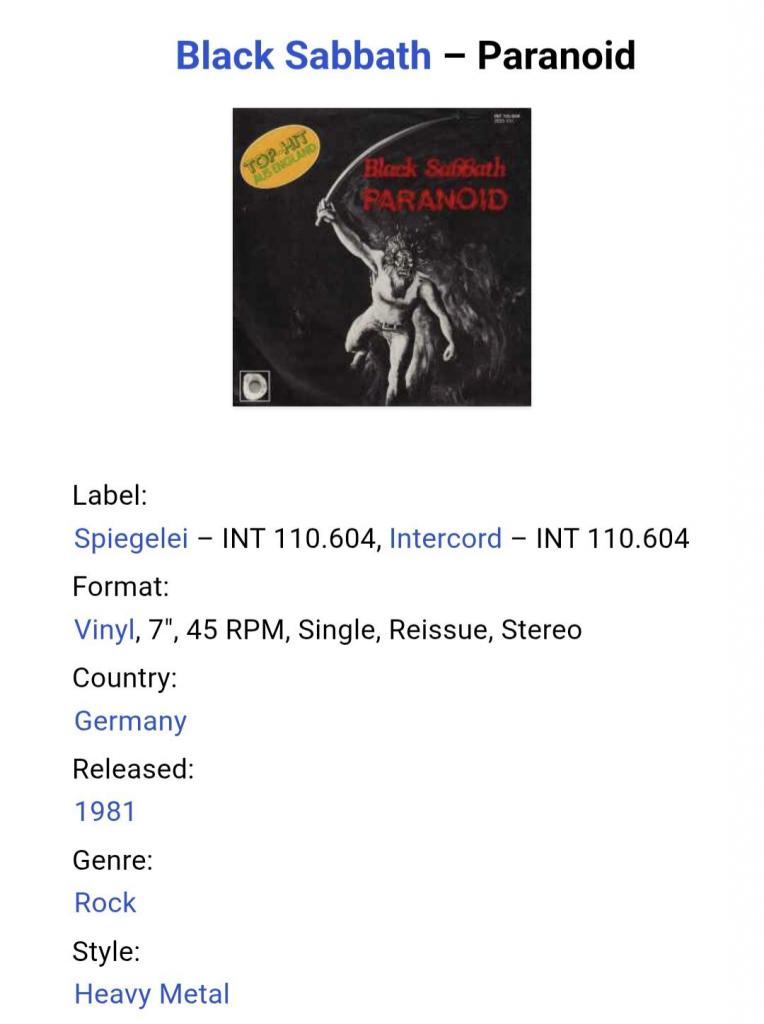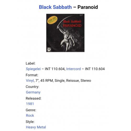 Вінілова платівка. Студійний міні сингл (ЕР) 7, легендарної Британської хард-рок, хеві метал групи Black Sabbath, до складу якої входили, на той час, Оззі Осборн, Тоні Айоммі, Гізер Батлер та Білл Ворд (Paranoid / Snowblind) 1970-72. Випуск фірми (Spiegelei / Intercord) Germany, 1981-ий рік. Оригінальне, першопресове, Німецьке видання. Рідкісне (Rare). Стан платівки EX. Стан конверту VG+. Відправка по Україні службами доставки: Нова Пошта, Укр Пошта, Делівері. Також відправляємо посилки за кордон по цілому світу.