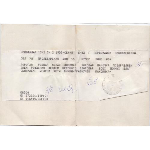 бланк телеграммы ТЛГ В. Зарубин Поздравляю! 12.09.1986 серия Т-18 в25-01