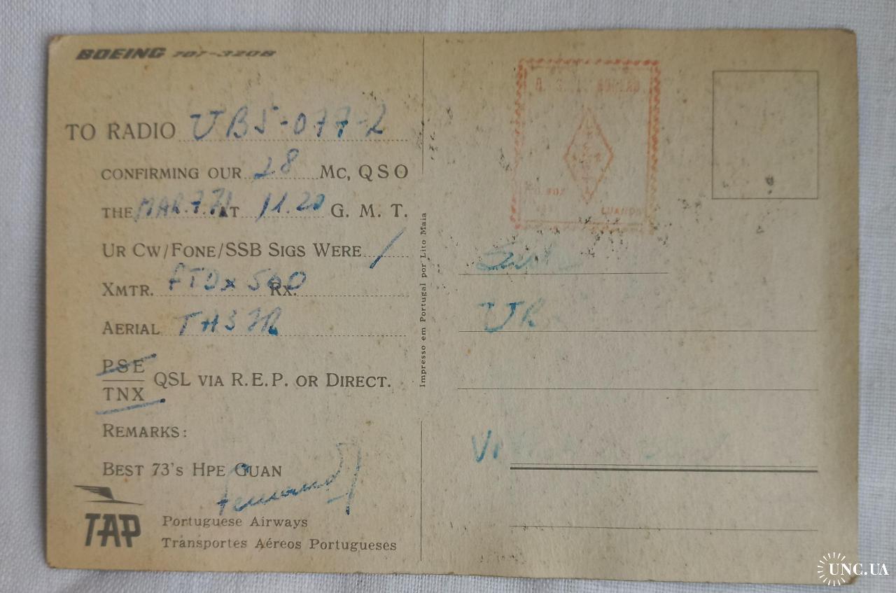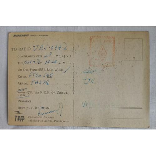 1961-1980Использован бланк рекламной открытки с изображением пассажирского самолета. Также на лицевой стороне размещен позывной сигнал радиолюбителя из Анголы и его почтовый адрес. . На обратной – аббревиатура «ТАР» («Португальские авиалинии») и данные радиообмена в эфире. Следы времени. Состояние хорошее.