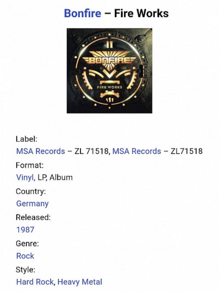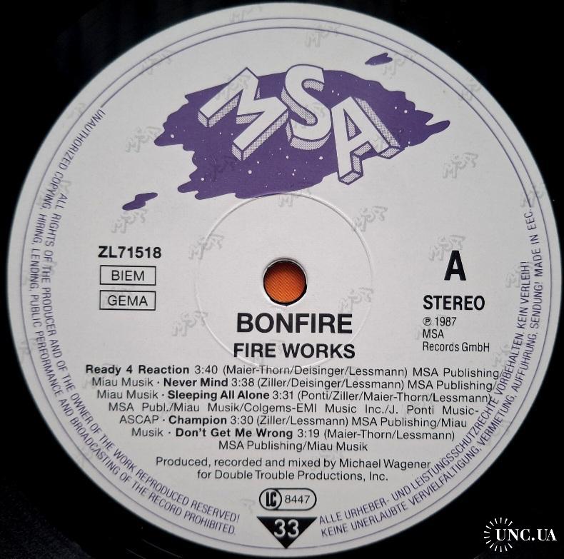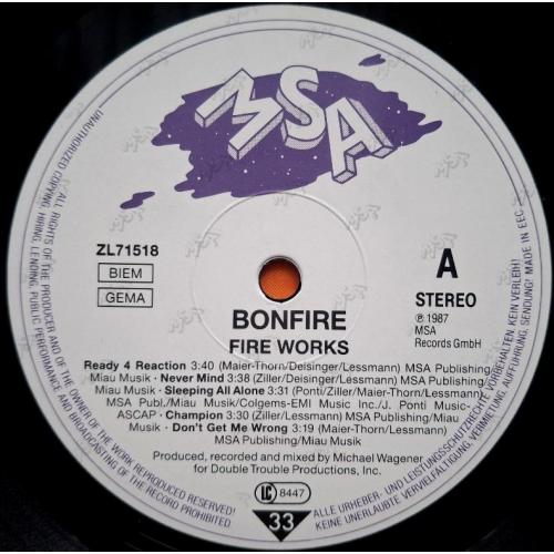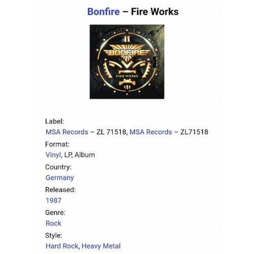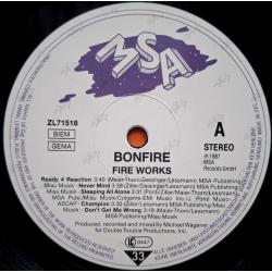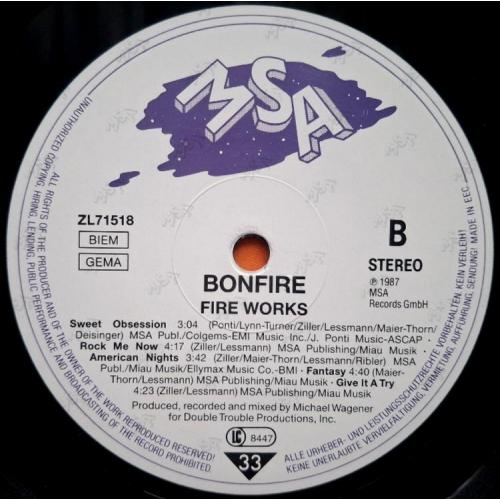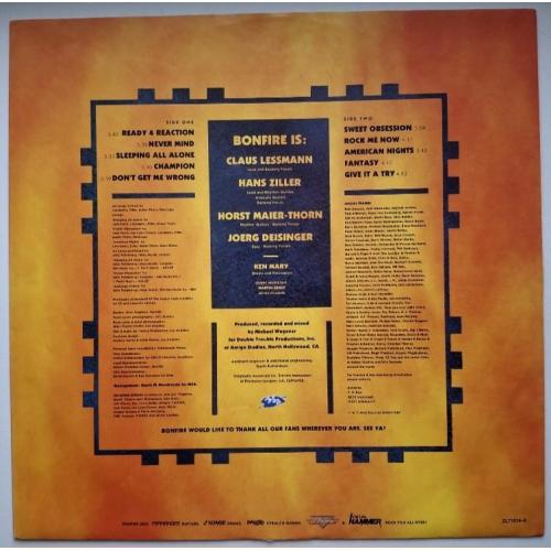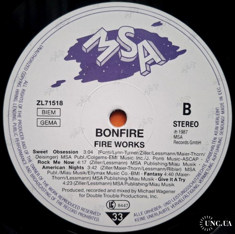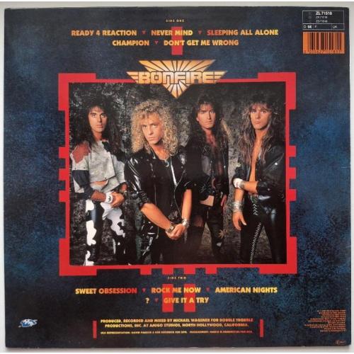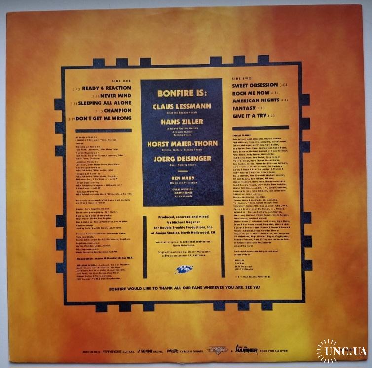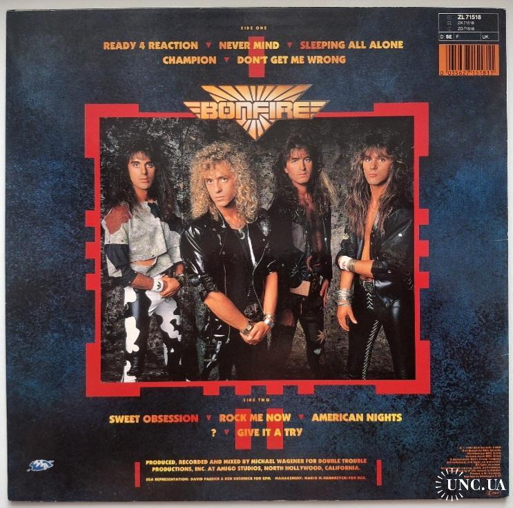 Вінілова платівка. Другий, в дискографії, студійний, альбом, Німецької хард-рок, хеві-метал групи Bonfire, яка складалась на той час з учасників: Клауса Лесмана, Ханса Ціллера, Хорста Майєра Торна та Йорга Дайсінгера (Fire Works) 1987. Випущено фірмою (MSA Records) Germany, 1987-ий рік. Оригінальне, першопресове, Німецьке видання. Стан платівки ЕХ+. Конверт глянцевий. Стан конверту EX+. В комплекті внутрішня вставка. Відправка по Україні службами доставки: Нова Пошта, Укр Пошта, Делівері. Також відправляємо посилки за кордон по цілому світу.