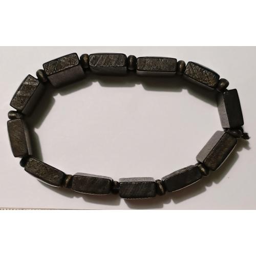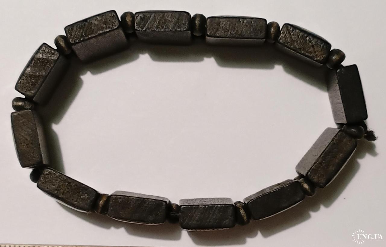 Деревянный из 12 частей, через две бусинки, на резинке. В двух местах по одной бусинке не хватает.