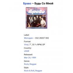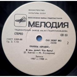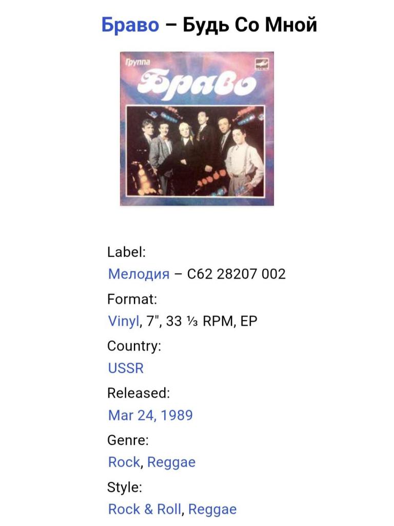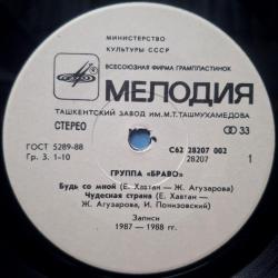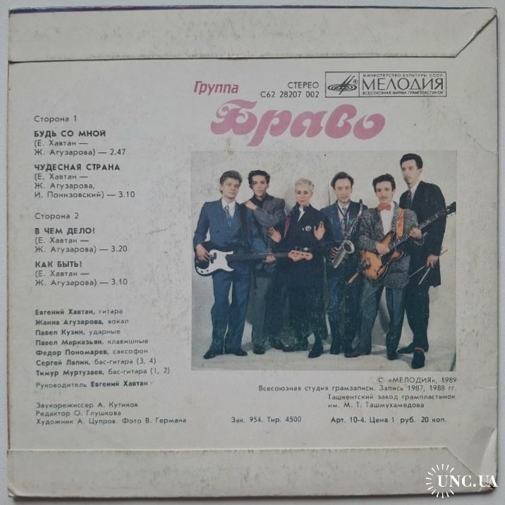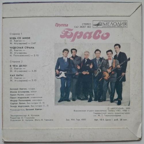 Вінілова платівка. Другий, в дискографії, студійний міні сингл (ЕР 7), російської (радянської) біг-біт, рок, реггі групи Браво (Будь Со Мной) 1987-88. Випуск фірми (Мелодія) СРСР, Ташкентський Завод Грамплатівок, 1989-ий рік. Оригінальне, першопресове видання Лімітований тираж (Limited Edition). Рідкісне. Стан платівки ЕХ. Стан конверту ЕХ+. Відправка по Україні службами доставки: Нова Пошта, Укр Пошта, Делівері. Також відправляємо посилки за кордон по цілому світу.