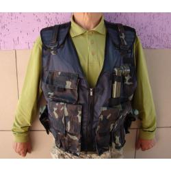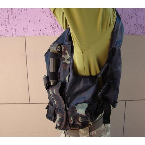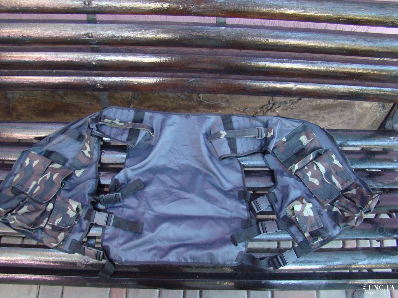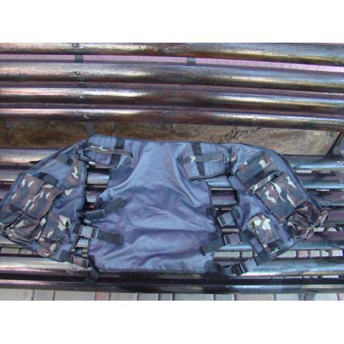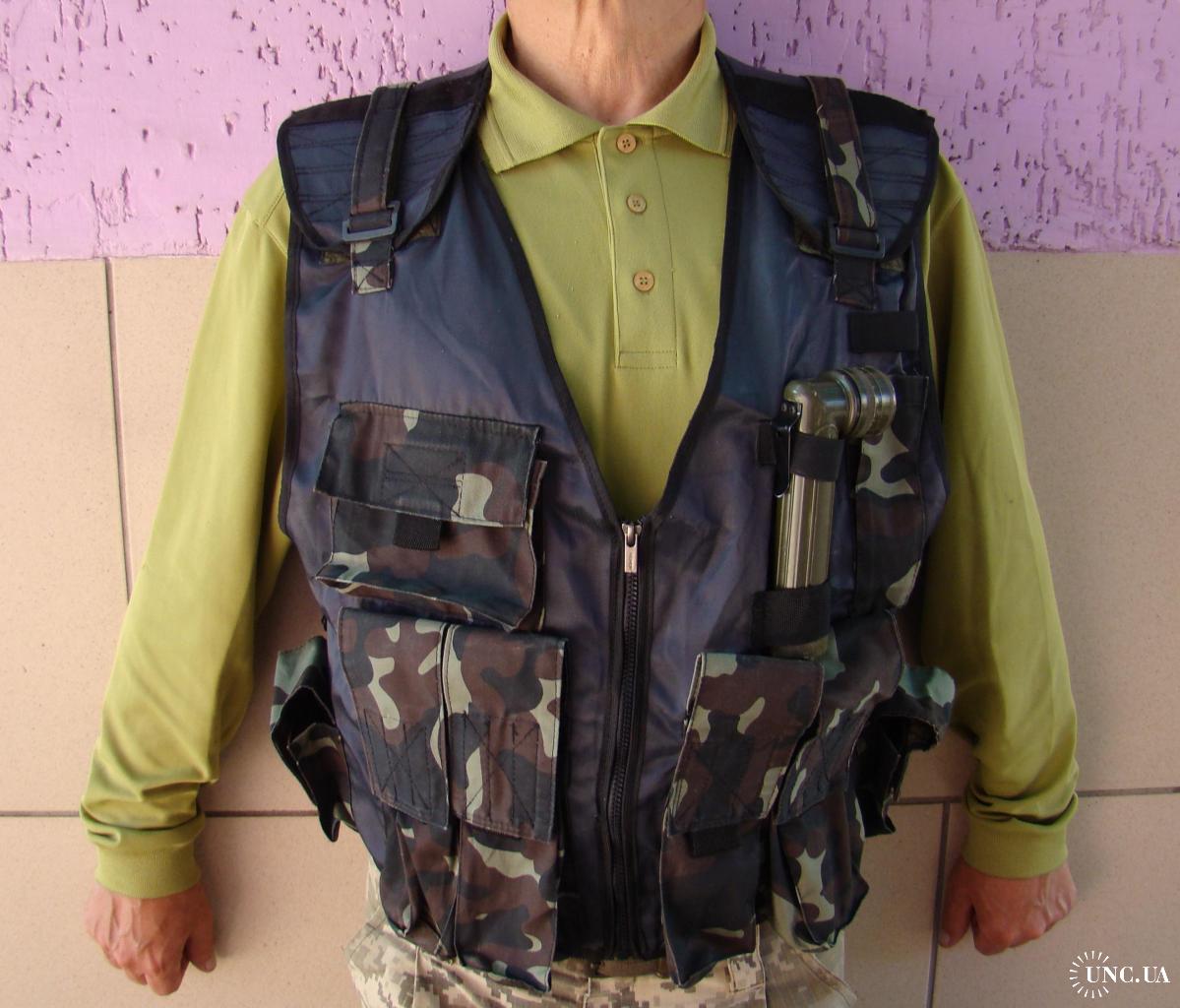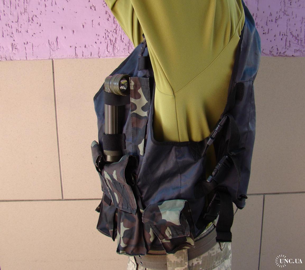 Минимальное б/у в хорошем состоянии. Впереди застегивается на молнию. На жилете имеются 4 подсумка для магазинов АК, застегиваются на липучки. Также 2 подсумка для гранат Ф-1 или РГД-5, тоже на липучках. Выше карман для мобильного телефона или чего-то другого. Есть карман для тактического ножа и резиновые крепления для подвеса тактического фонарика (на фото видно, как крепится фонарик). Объем регулируется с помощью ременных утяжек на клипсах. Высота регулируется с помощью липучек и ременных утяжек. В остальном все как на фото.