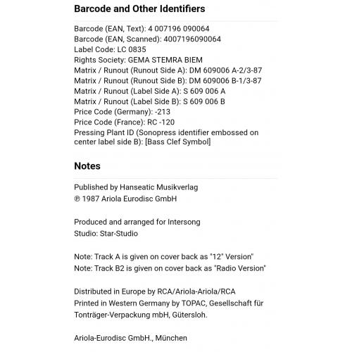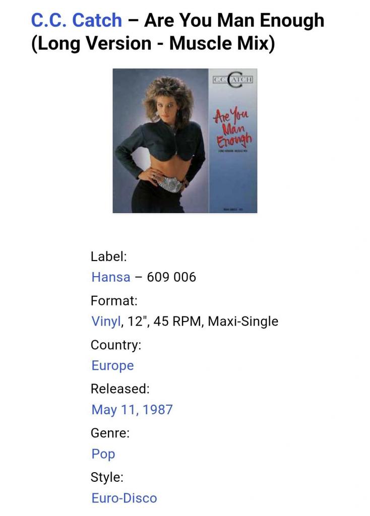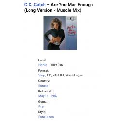 Вінілова платівка. Шостий, в дискографії, студійний максі сингл (EP 12), легендарної Німецької виконавиці Голландського походження, стилю Євро Диско, Кароліни Катерини Мюллер, більше відомої під сценічним ім,ям C.C. Catch (Are You Man Enough?) 1987. Випуск фірми (Hansa) Germany, 1987-ий рік. Оригінальне, рідне, першопресове Німецьке видання. Стан платівки EX+. Конверт глянцевий. Стан конверту ЕХ+. Відправка по Україні службами доставки: Нова Пошта, Укр Пошта, Делівері. Також відправляємо посилки за кордон по цілому світу.