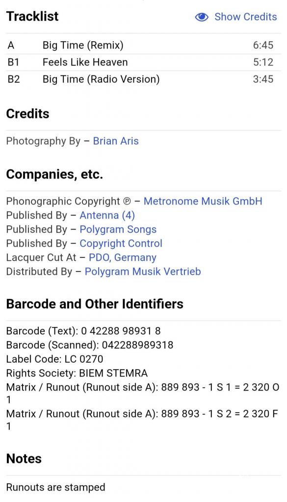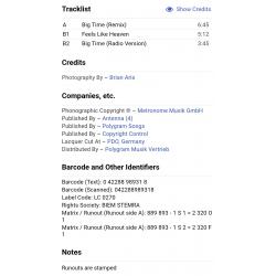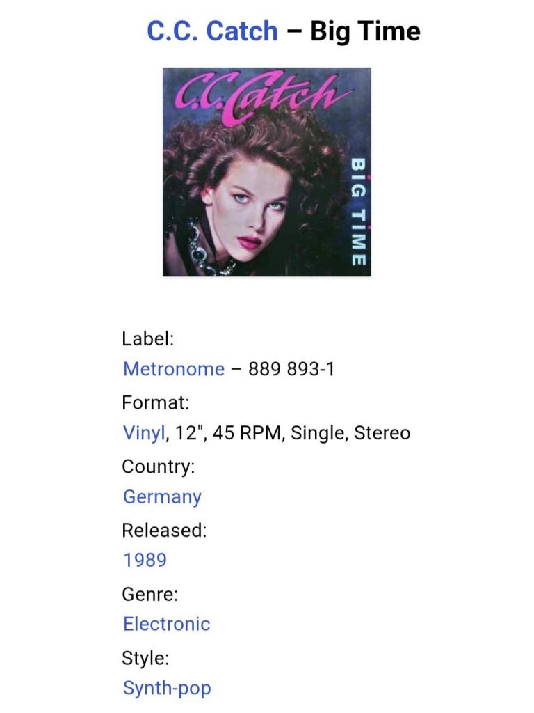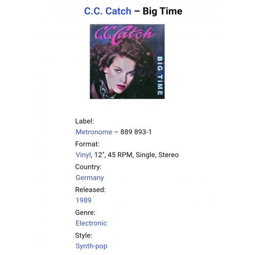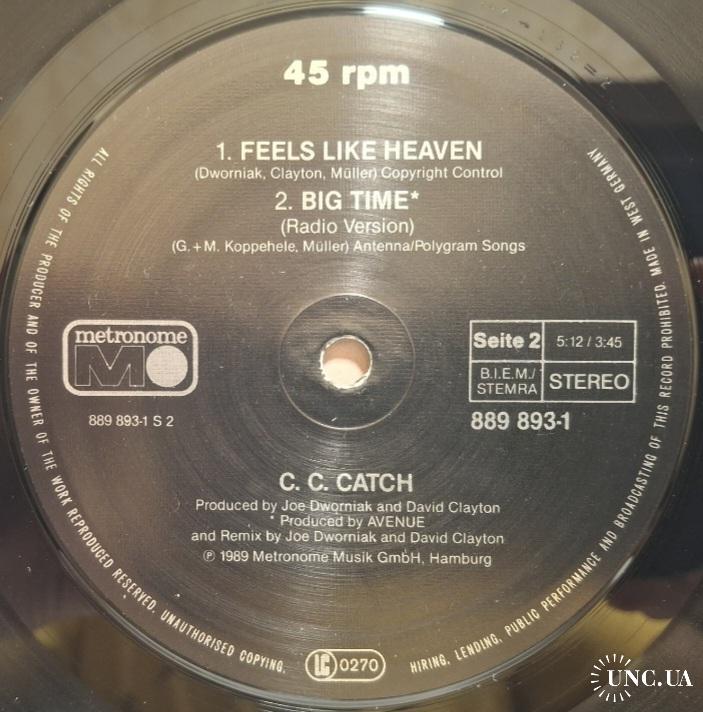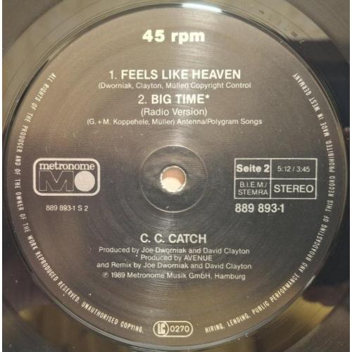 Вінілова платівка. Одинадцятий, в дискографії, студійний максі сингл (EP 12), легендарної Німецької виконавиці Голландського походження, стилю Євро Диско, Кароліни Катерини Мюллер, більше відомої під сценічним ім,ям C.C. Catch (Big Time) 1989. Випуск фірми (Metronome) Germany, 1989-ий рік. Оригінальне, першопресове, рідне Німецьке видання. Стан платівки EX. Конверт глянцевий. Стан конверту ЕХ-. Відправка по Україні службами доставки: Нова Пошта, Укр Пошта, Делівері. Також відправляємо посилки за кордон по цілому світу.
