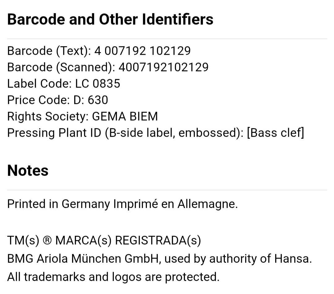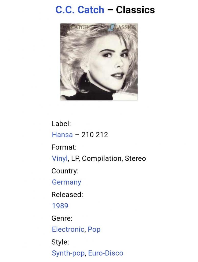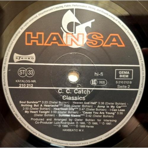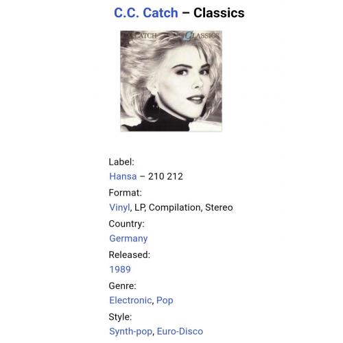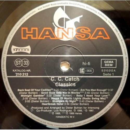 Вінілова платівка. Третя, офіційна збірка найкращих хітів, за всю дискографію, легендарної Німецької виконавиці Голландського походження, стилю Євро Диско, Кароліни Катерини Мюллер, більше відомої під сценічним ім,ям C.C. Catch (Classics) 1985-89. Випуск фірми (Hansa) Germany, 1989-ий рік. Оригінальне, рідне, першопресове Німецьке видання. Стан платівки VG (поверхневі потертості на вид, по звуку все добре. Звучить без перешкод). Стан конверту ЕХ. Відправка по Україні службами доставки: Нова Пошта, Укр Пошта, Делівері. Також відправляємо посилки за кордон по цілому світу.