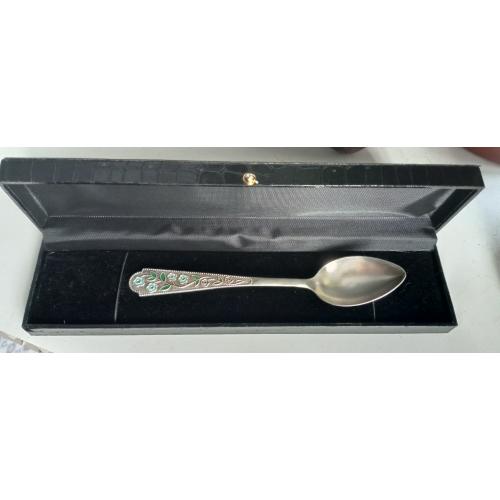 1941-1960Антикварна чайна ложка зі срібла 875 проби, ручка якої прикрашена емалевим, квітковим візерунком (Незабудки). Техніка "перегородчастої емалі". Виробник Ленінградська ювелірно-годинкова фабрика (клеймо «ЛЮ») або завод «Російські самоцвіти».