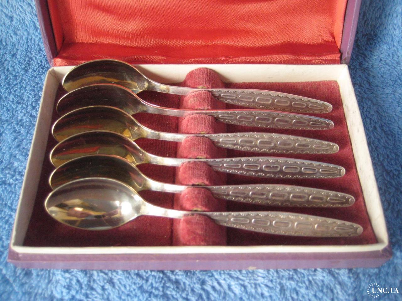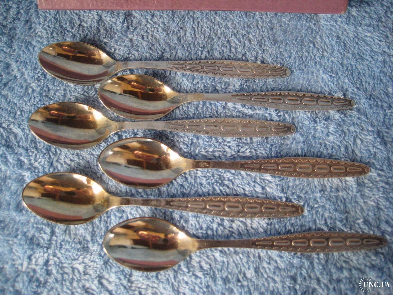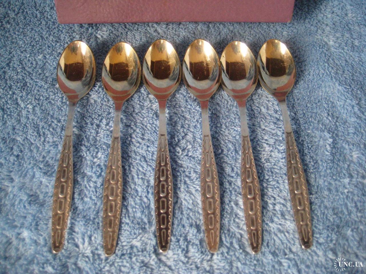 1961-1980№877. Оригинальный набор чайных ложек в коробке - 6 шт. (посеребрение, позолота) - Кольчугино МНЦ 1970-1980 СССР, в хорошем коллекционном состоянии (родная патина),см.фото. На изделиях имеется клеймо завода - Глухарь. Длина ложек - 14см. Пересылка по Украине - Новой почтой, Укрпочтой. Для киевлян возможность встречи и просмотра (воскр. метро Нивки). В РФ и Белоруссию не отправляю!