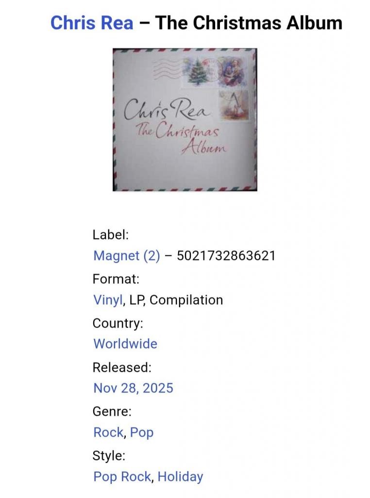 2021-....Вінілова платівка. Двадцять сьомий, в дискографії, студійний (Різдвяний) альбом, Британського поп-рок, блюз-рок музиканта Крістофера Ентоні Рі (The Christmas Album) 2025. Випуск фірми (Magnet) Germany, 2025-ий рік. Видання нове, запаковане. Категорія S/S. Відправка по Україні службами доставки: Нова Пошта, Укр Пошта, Делівері. Також відправляємо посилки за кордон по цілому світу.