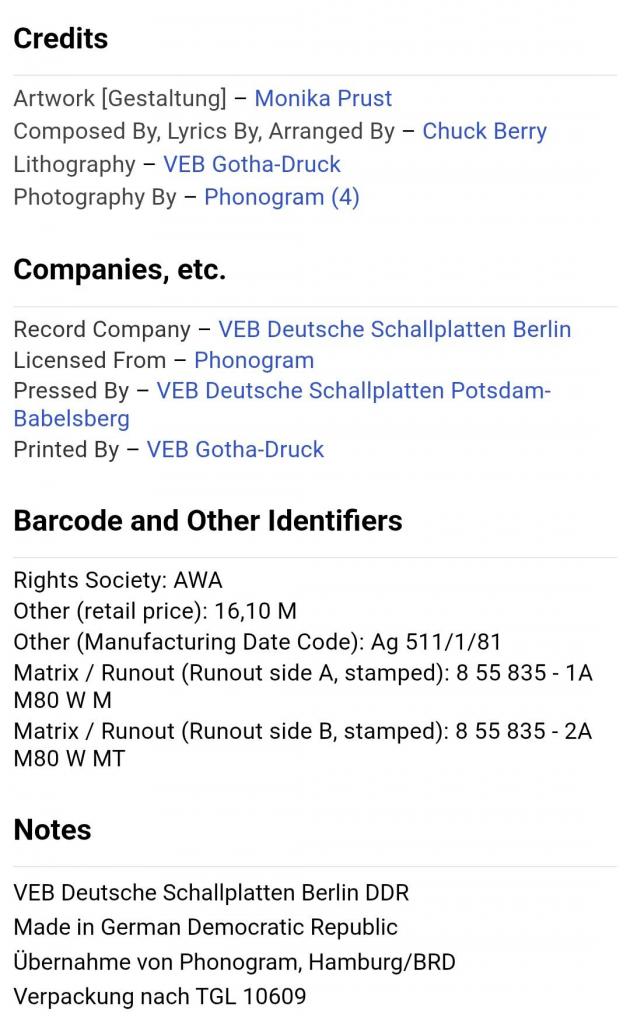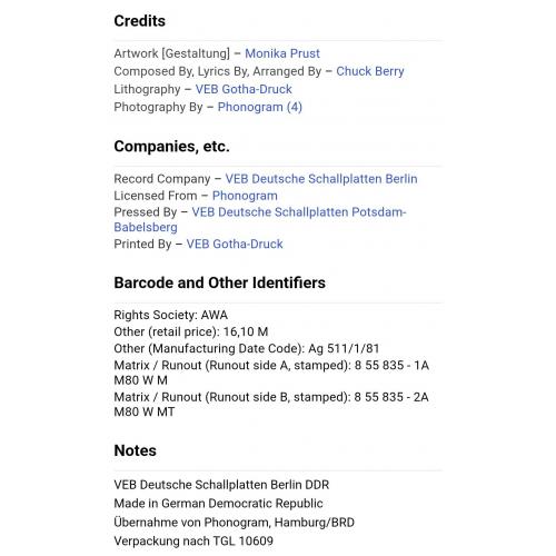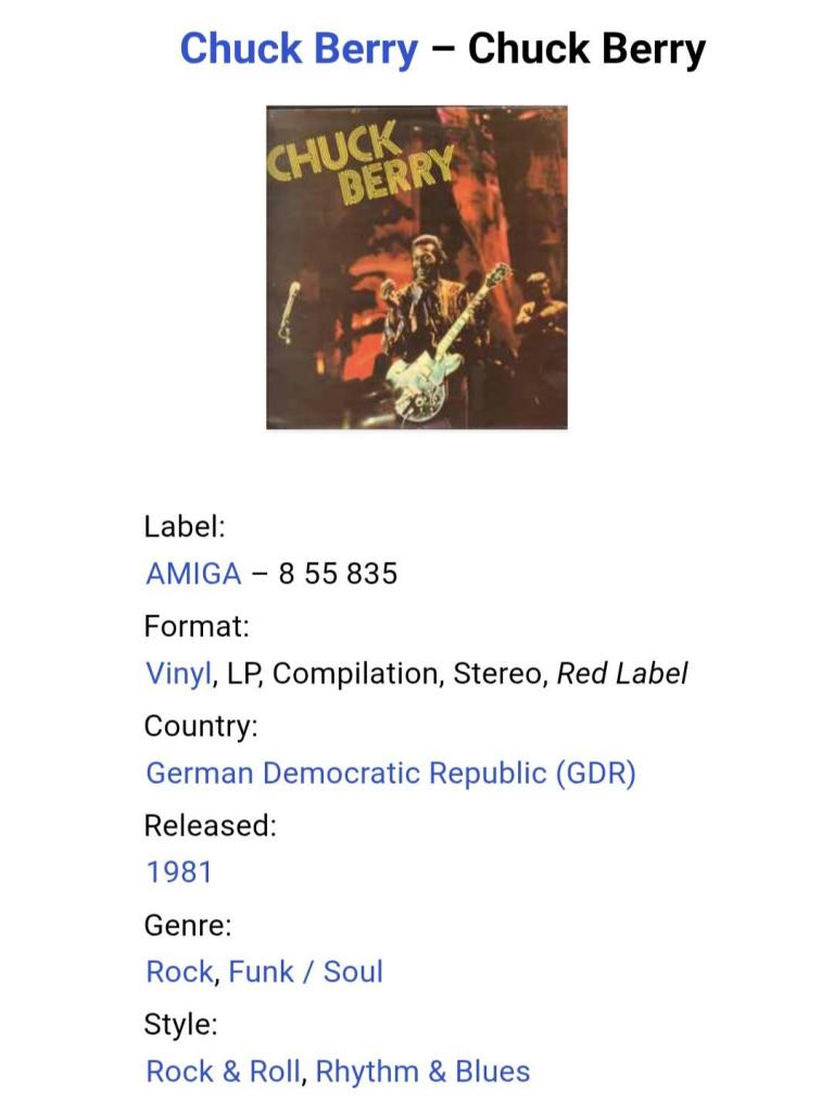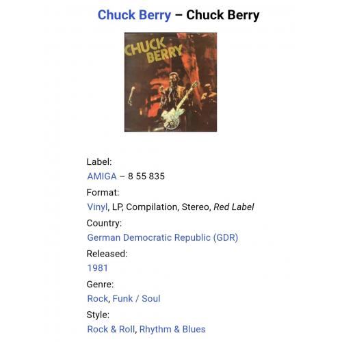 Вінілова платівка. Збірка найкращих хітів, легендарного Американського піонера рок-н-ролу, володара посмертних титулів зали слави рок-н-ролу, Polar Music Prize, зірки Голлівудської Алеї Слави, покійного вже Чарльза Едварда Андерсона Беррі, більше відомого під скороченим ім'ям Чак Беррі (The Best Of) 1957-79. Випуск фірми (Amiga) DDR, 1981-ий рік. Оригінальне, Німецьке видання. Стан платівки ЕХ+. Стан конверту EX+. Відправка по Україні службами доставки: Нова Пошта, Укр Пошта, Делівері. Також відправляємо посилки за кордон по цілому світу.