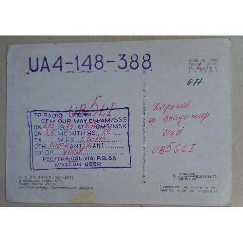 1961-1980ХудожникФ.А.Васильев (1850-1873). Государственная Третьяковская галерея. Ид-во "Изобразительное искусство", Москва. Тираж 35 000. Обратная сторона заполнена как QSL-карточка с данными радиолюбительского обмена в эфире. Дефекты: малозаметные трещинки в текстуре открытки.
