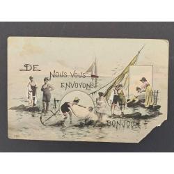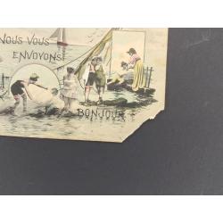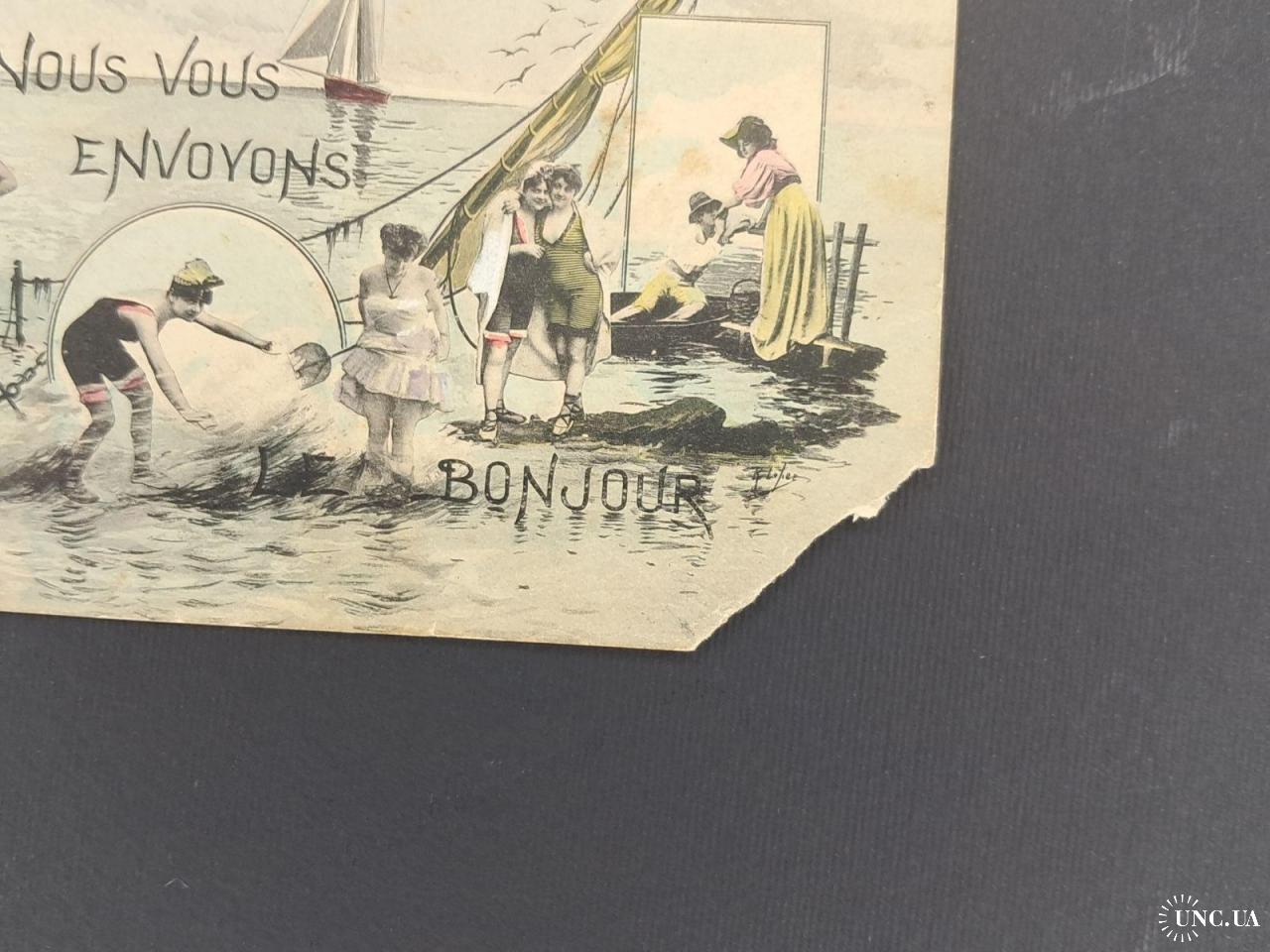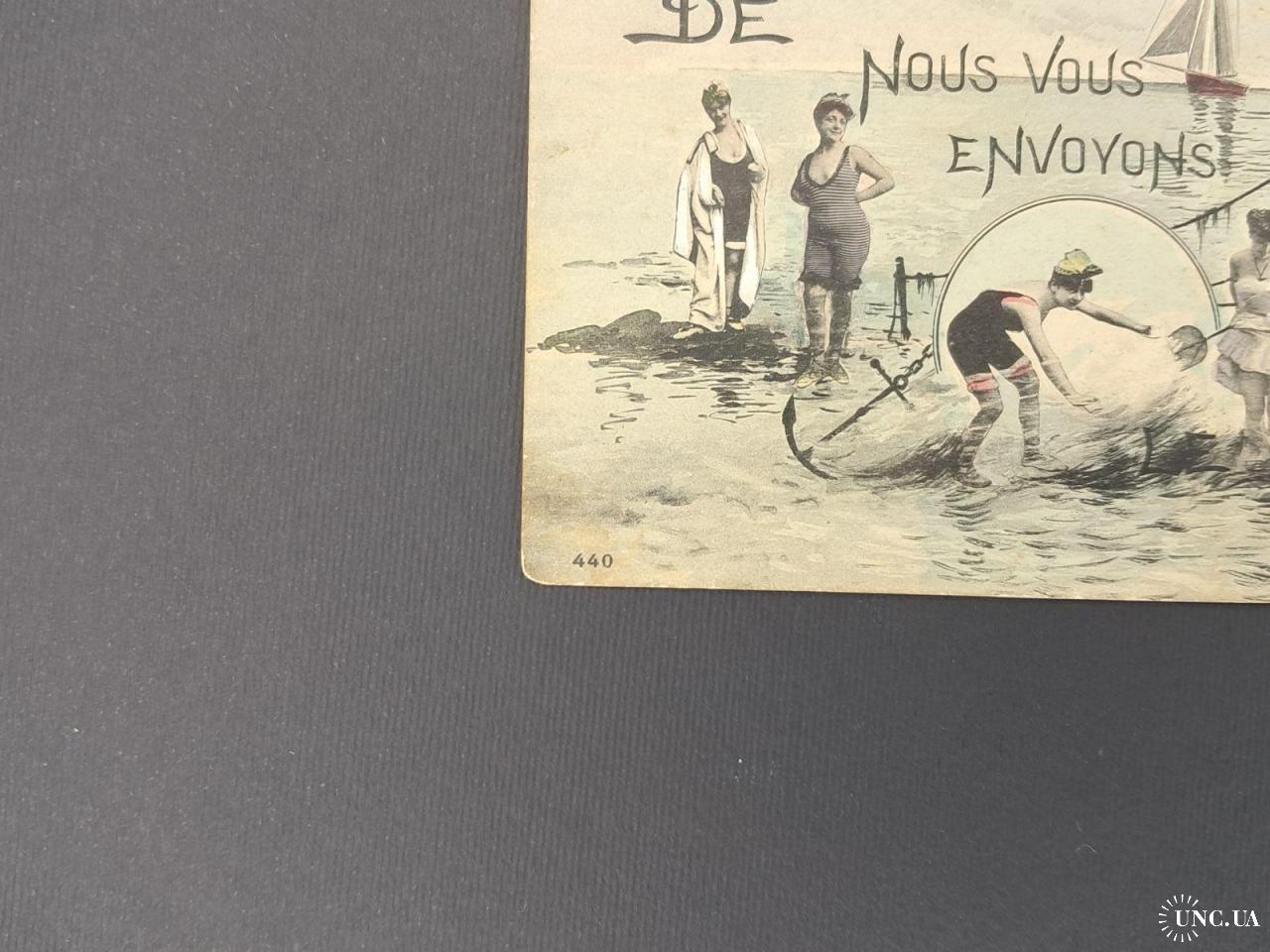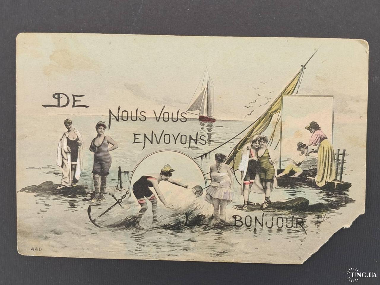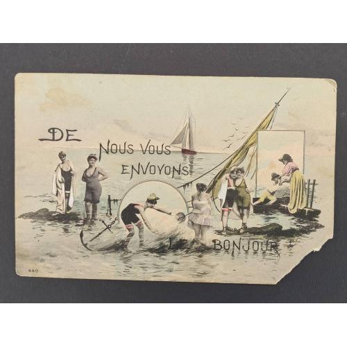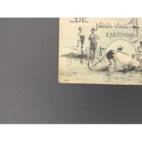 De nous vous envoyons bonjour (Ми передаємо вам привіт). Листівка початку 20 століття, що ілюструє купальну моду початку 20 століття.
