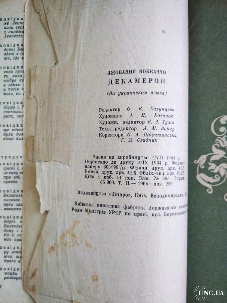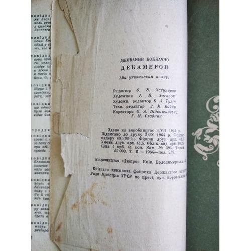 декамерон українською, джовані боккаччо, 1964, видавництво дніпро, тверда обкладинка, є пошкодження та склеювання, немає титульної сторінки, потемнілі від часу сторінки, деякі сторінки мають пошкодження, внутрішній стан сторінок - задовільний.