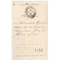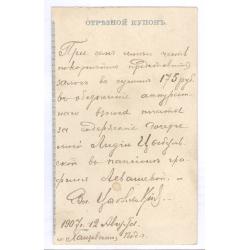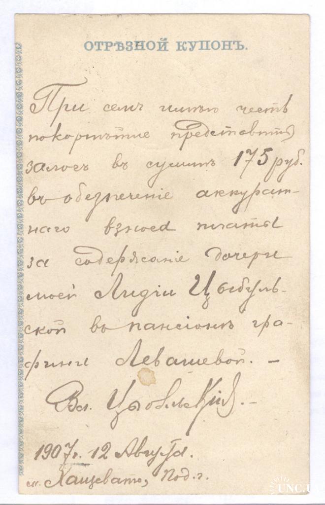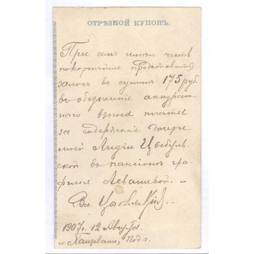 Отрезной купон денежного перевода 175 рублей, отправленного Владимиром Цыбульским из Хащевато Подольской губернии 12 августа 1907 года в Пансион графини Левашовой за содержание его дочери Лидии Цыбульской.