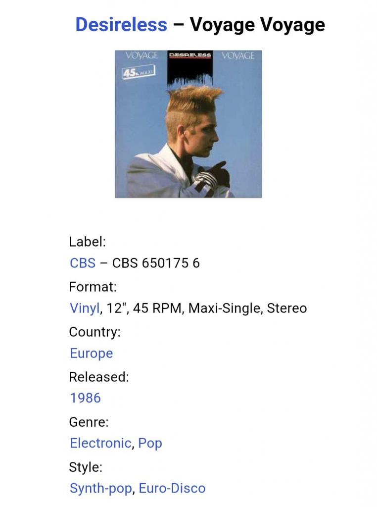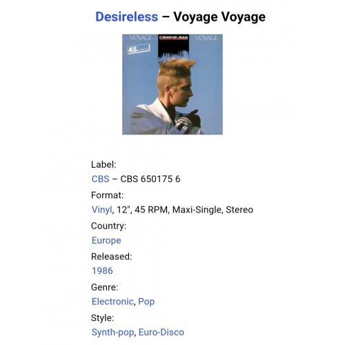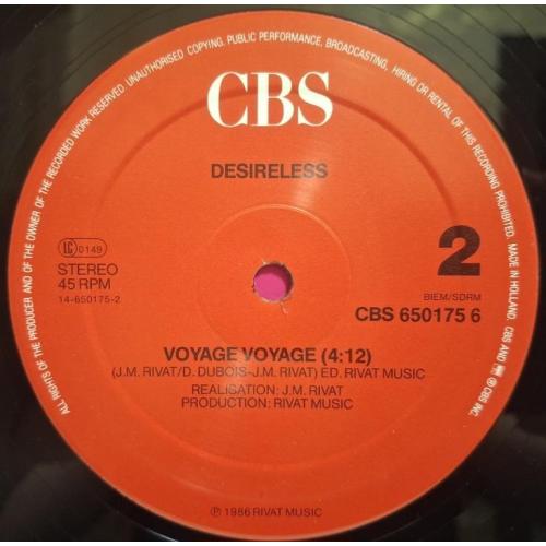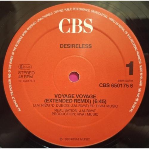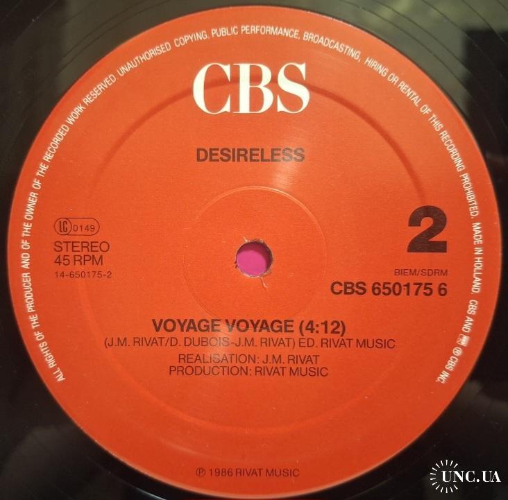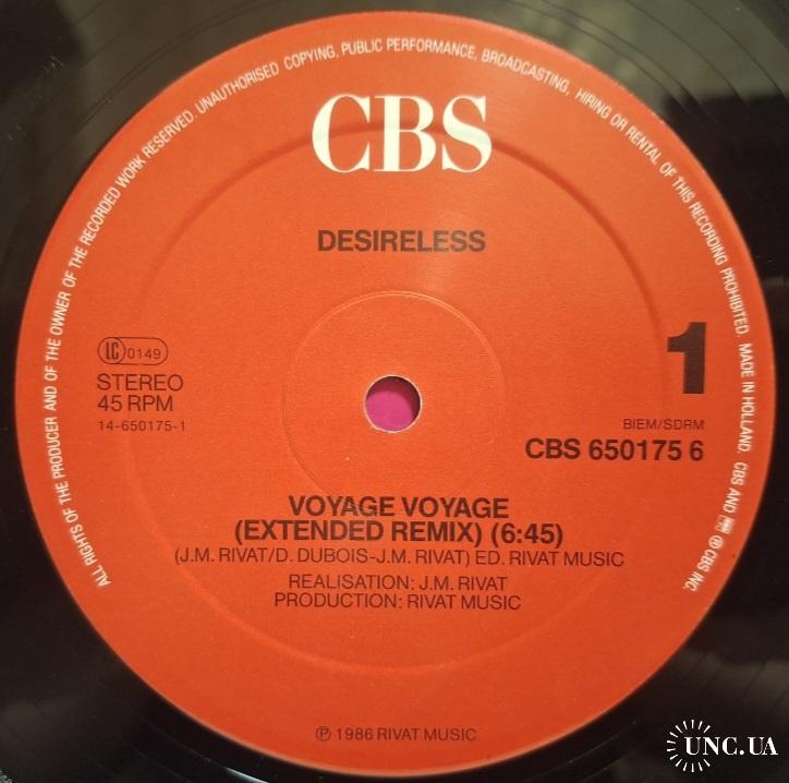 Вінілова платівка. Перший, дебютний, в дискографії, студійний максі сингл (ЕР 12), Французької сінті поп, євро диско виконавиці, Клоді Фрітш- Мантро, більше відомої, під сценічним ім'ям Desireless (Voyage Voyage) 1986. Випуск фірми (CBS) Holland, 1986-ий рік. Оригінальне, першопресове, Голландське видання. Стан платівки ЕХ+. Стан конверту EX+. Відправка по Україні службами доставки: Нова Пошта, Укр Пошта, Делівері. Також відправляємо посилки за кордон по цілому світу.