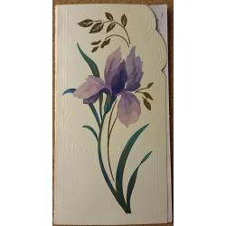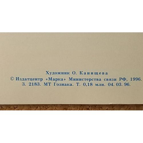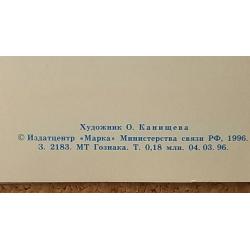 1981-2000Цветок сиреневого цвета на фоне золотистых листьев. Карточка изготовлена на матовой мелованной бумаге с блинтовым тиснением и нанесением золотистой фольги. Минсвязи РФ. Т. 0,18 млн. Карточка двойная, подписанная. Без дефектов. Состояние отличное.