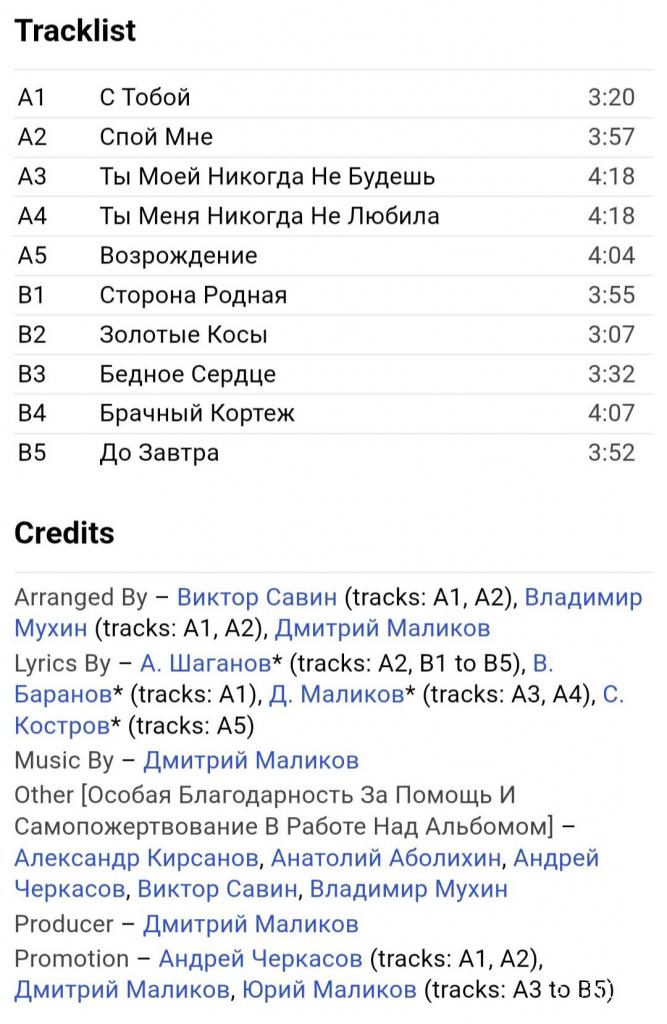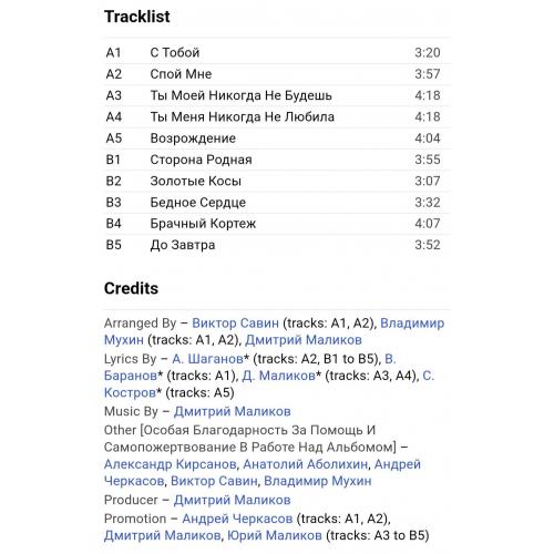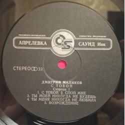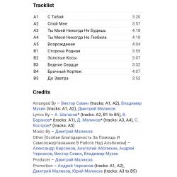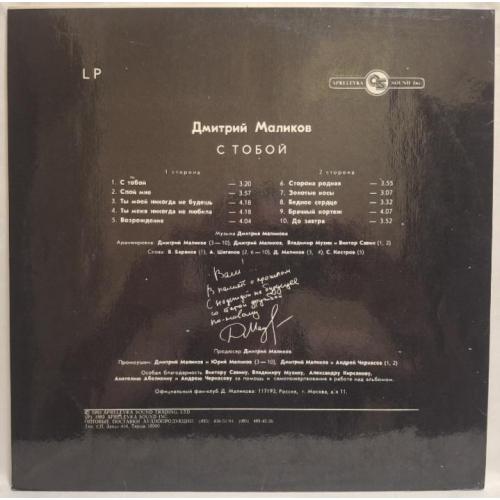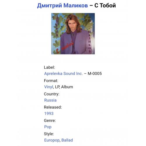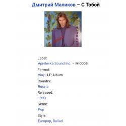 1981-2000Вінілова платівка. Другий, в дискографії, студійний альбом російського поп виконавця Дмитра Малікова (С Тобой) 1993. Випуск фірми (Aprelevka Sound Inc) Russia, 1993-ій рік. Оригінальне, першопресове видання. Рідкісне (Rare). Лімітований тираж (Limited Edition). Стан платівки VG+. Конверт ламінований. Стан конверту ЕХ+. Відправка по Україні службами доставки: Нова Пошта, Укр Пошта, Делівері. Також відправляємо посилки за кордон по цілому світу.