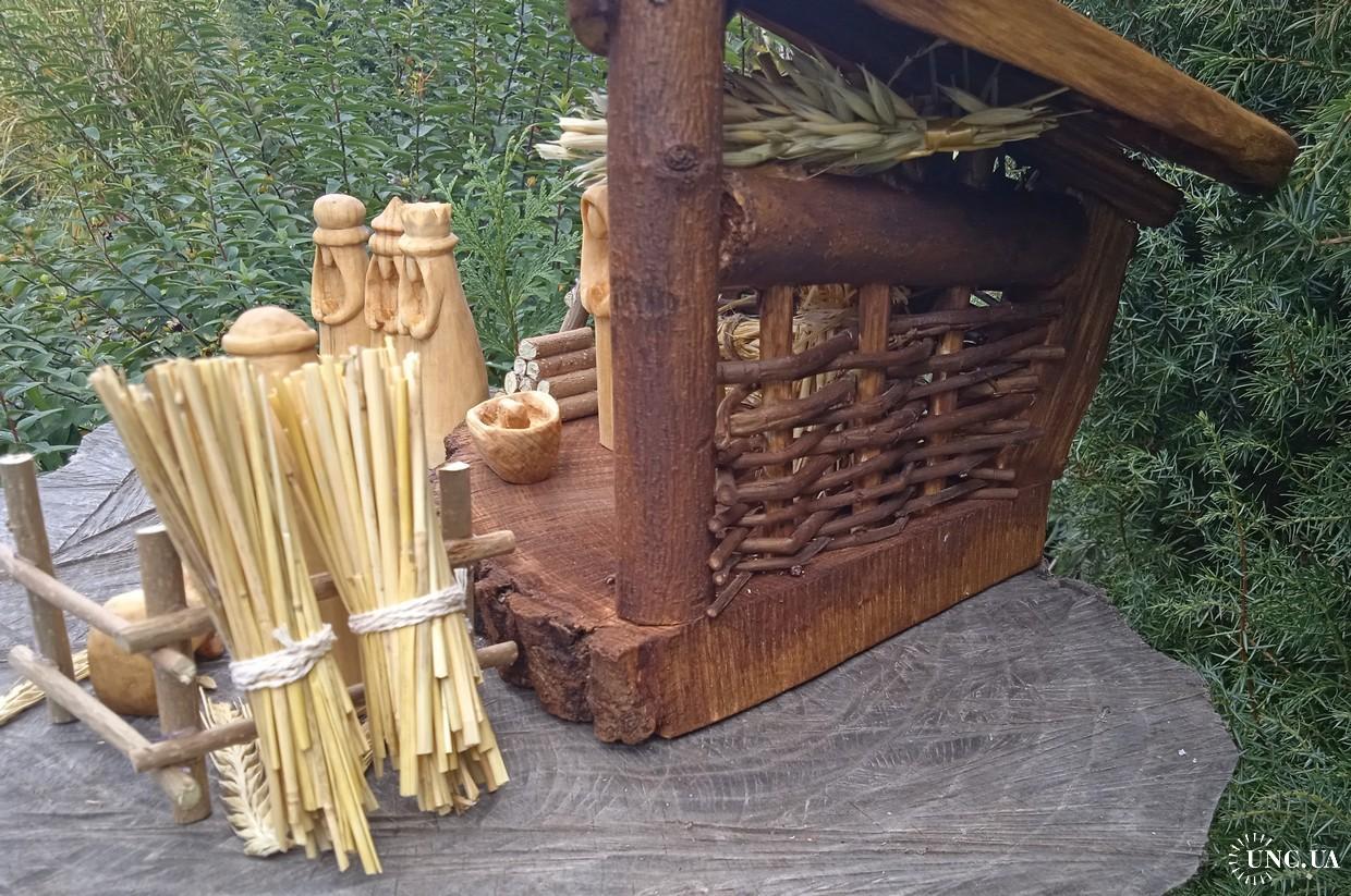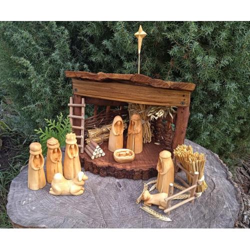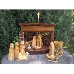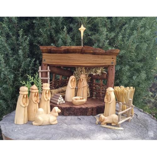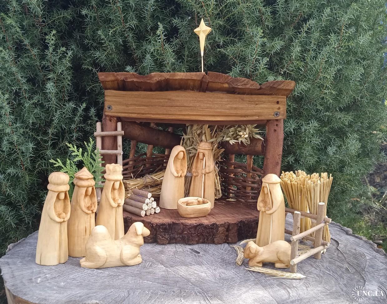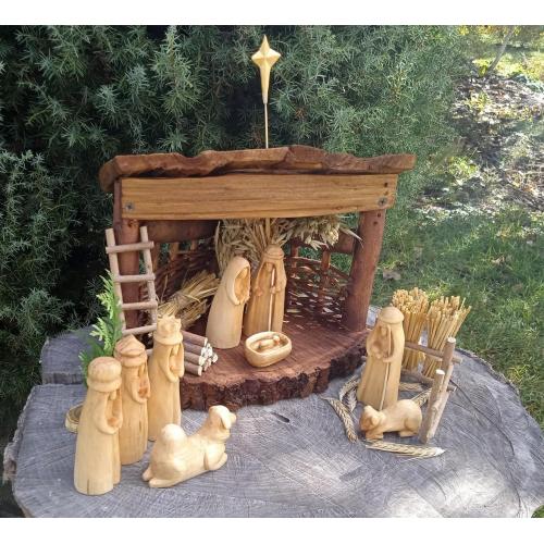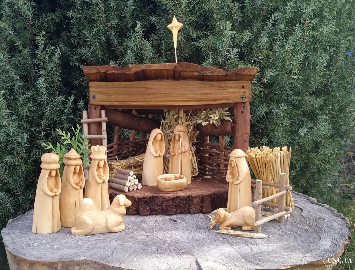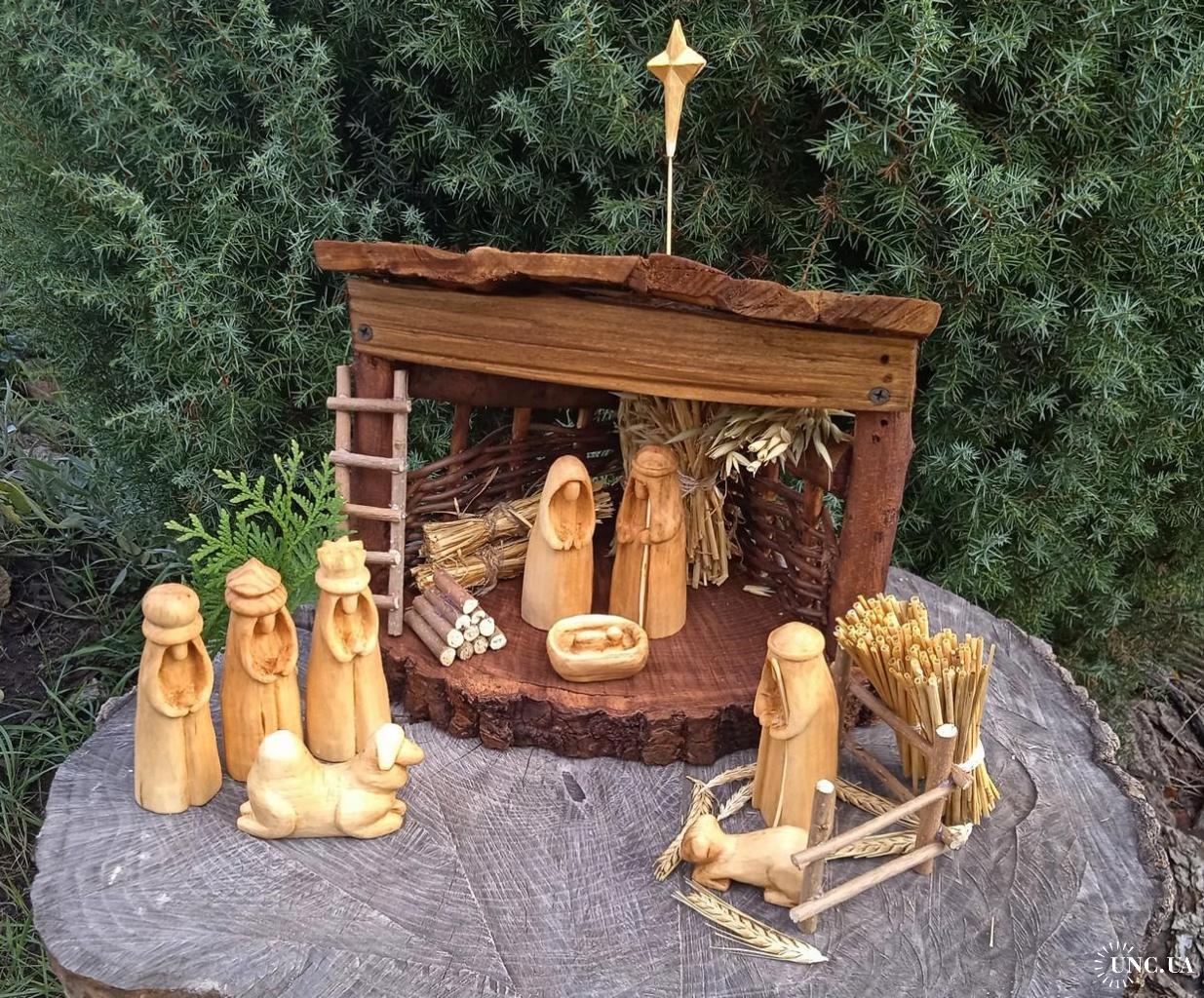 Різдвяна шопка з різьбленими вручну фігурками Божої Матері, Йосипа,